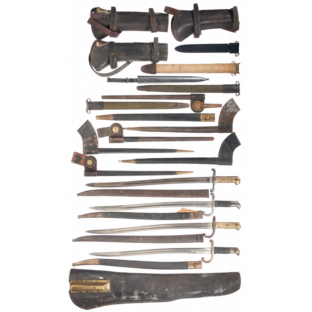 Lot includes 3 Rock Island Arsenal marked carbine boots, a scabbard for an M1 Garand Rifle, 12 loose bayonet sheaths, and four European saber bayonets with sheaths. All items fair or better.