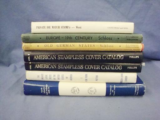 Useful lot of (7)hardbound philatelic research books incl. Private Die Stamps by West, Europe and Old German States by Schloss, (2)American Stampless Catalogs, Private Local Posts of the U.S. by Patton and North Atlantic Mail Sailings 1840-1875 by Hubbard