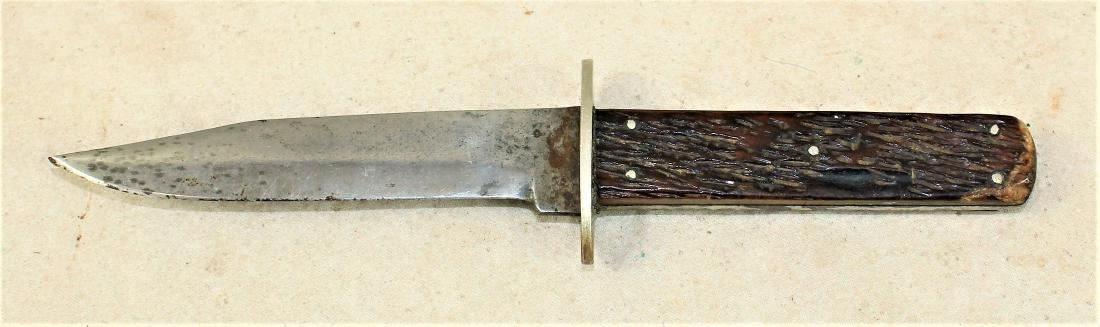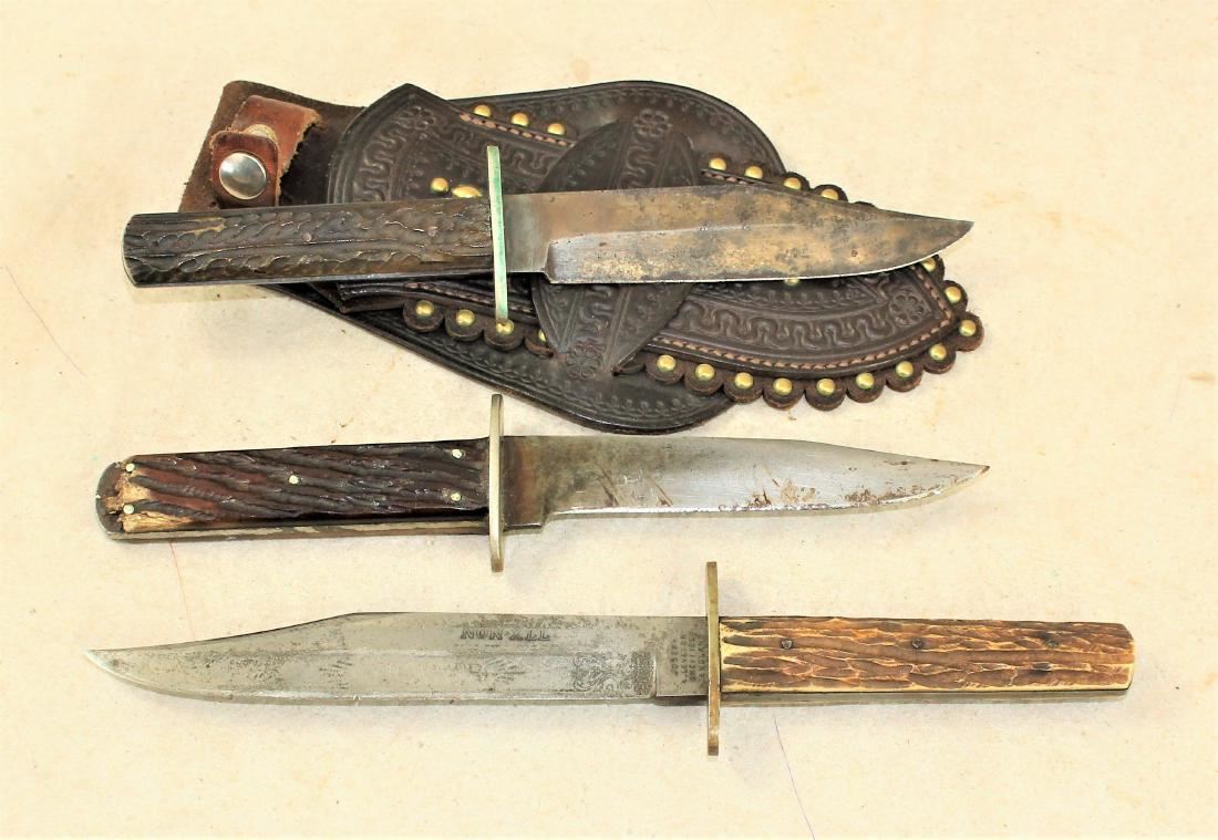 Three ranch used knives with stag handles. 1) 9" illegible mark with attractive studded sheith. 2) 11" Joseph Allen & Son, Sheffield England with acid etched blade reading " FRONTIER NON-XLL". 3) 8 1/2" clippoint blade with illedgible mark.