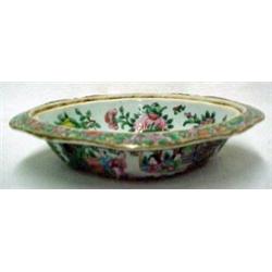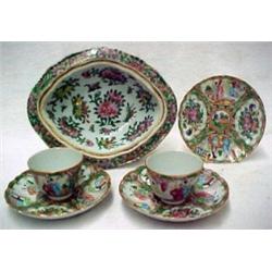 Grouping of Chinese Export including open vegetable dish 9" x 7 1/2" unmarked; three saucers approximately 5 1/2"; and two handleless cups 2 1/4" high; all late 19th C. (no noticeable defects)