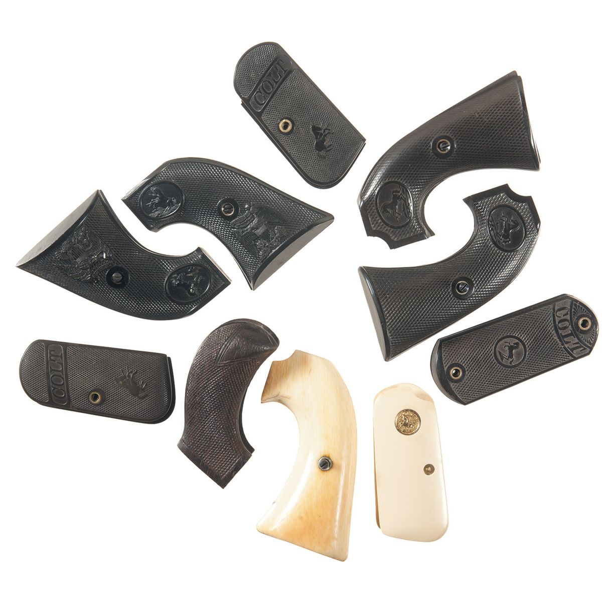 2 pair of checkered Single Action Army revolver grips with embossed Rampant Colt (very good), pair of smooth ivory Single Action Army revolver grips (very good), 2 pairs of checkered Single Action Army revolver hard rubber grips with embossed Rampant Colt and Federal Eagle (excellent), Colt checkered walnut one piece bird head grip (fine), pair of simulated ivory Model 1903 with gold Colt medallions (excellent), pair of checkered "COLT" banner and Rampant Colt pistol hard rubber grips (very good), 2 pairs of checkered "COLT" banner and Rampant Colt Model 1903 hard rubber grips (very good).