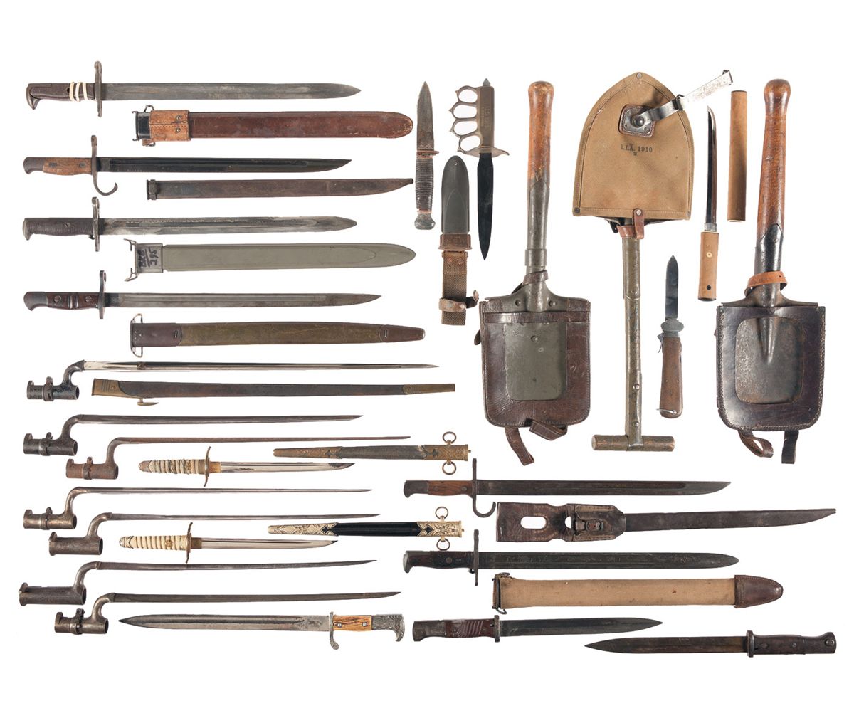 Gravity knife, USN MI fighting knife with sheath, ACS bayonet with engraved hardware and stag grip, reproduction U.S. 1918 trench knife, tanto with sheath, two knives with ray skin handle and decorative sheath, 5 German bayonets with scabbards, 6 U.S. bayonet with scabbards, 7 socket bayonets, 2 Japanese bayonets with scabbards, Marble's knife with sheath, unmarked knife with sheath, USMC Ka-Bar fighting knife with 3 trench shovels, leather belt. Overall good condition.
