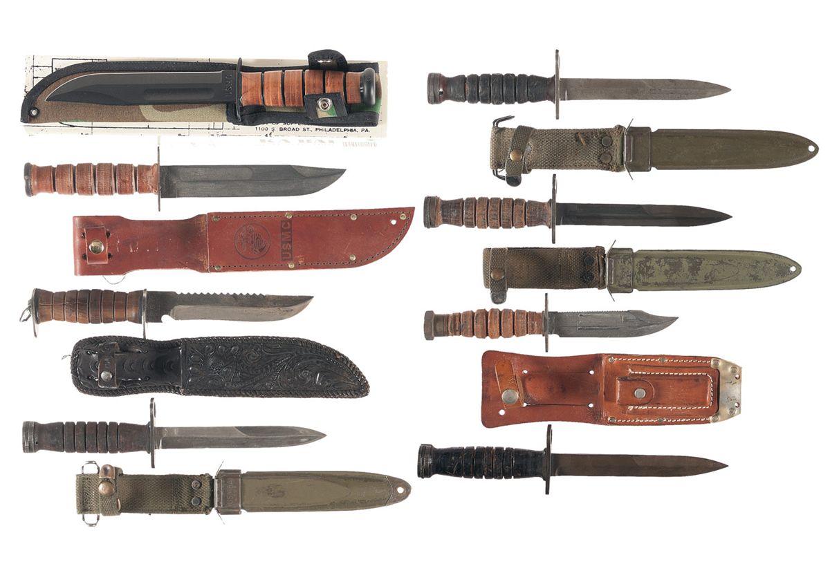 Ka-Bar Vietnam commemorative fighting knife with box and sheath (excellent), pilot survival type knife with sheath, Camillus M4 bayonet with scabbard, Utica M4 bayonet, Imperial M4 bayonet with scabbard, EGW knife (cracked handle) with tooled sheath, Utica M4 bayonet with scabbard, USMC Camillus fighting knife with sheath. Unless noted items are in good to very good condition.