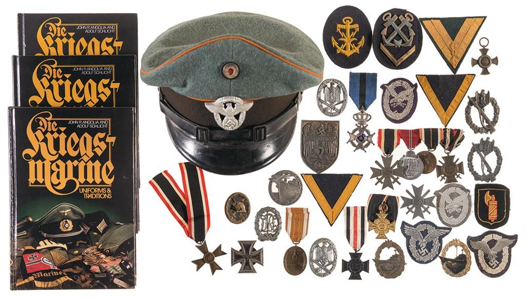 Ten German military patches, two British military medals, ten German military medals, ten German military badges, 1 German Field Police NCO visor hat, and three volumes of Die Kriegsmarine: Uniforms and Traditions by John R. Angolia and Adolf Schlicht.