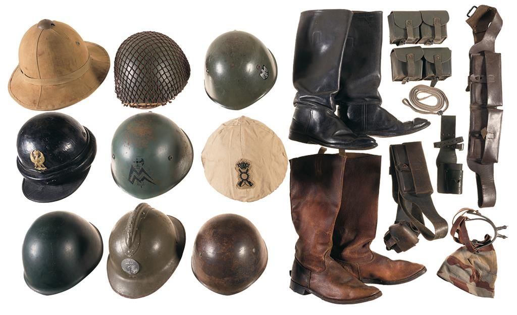 Four Italian M-33 helmets (one with helmet cover), one Italian M-33 helmet with German swastika decal, one Italian WWII motorcycle dispatcher helmet, one post war Italian paratrooper helmet with chin strap and net cover, one pith helmet, one French Model 1926 helmet with anchor symbol, one Italian camouflage helmet cover, 2 pairs of leather boots (one with spurs), two Italian WWII bandoliers, two Italian WWII ammo pouches, one Italian WWII entrenching tool/bayonet frog, one leather pistol lanyard. Fair to good.