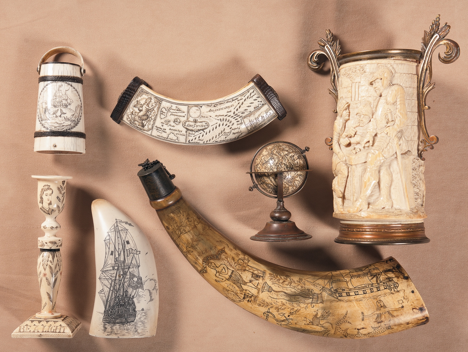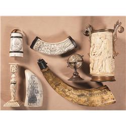 All pieces feature a scrimshawed motif that are highly detailed and are done by a professional. 1) 6 1/2 inch piece of ivory tusk with wood cap on both ends. An exquisite 1700's British/French naval battle scene with a mermaid is featured on the tusk. The scene depicts a bird's eye view of the Battle of Dominica on April 9th 1782. The Battle of Dominica or Battle of the Saintes was a British victory over the French fleet which forced the French and Spanish to abandon a planned invasion of Jamaica. Excellent. 2) Whale tooth elaborate pirate ship on one side and pirate on the other, signed "GASPAR". Excellent. 3) Extensively detailed table top globe with metal base. The globe is geographically marked. Overall height: 4 1/2". Excellent. 4) 4" long piece of ivory with whale hunting scene. Excellent. 5) 7" tall candle stick LET ME BE A LIGHT IN YOUR DARKNESS" on the base and a ship and portrait of a women at the top. Excellent. 6) 12 1/2" long powder horn with a ship and figured motif along with "TOUCHe PAS MUeA" in a banner. Fine, with chipping near the base. 7) High relief chiseled knight scene on a hollow cylinder shaped piece of ivory. With metal base and top measures 8 1/4" tall with metal handle like decorations on the sides. Excellent.