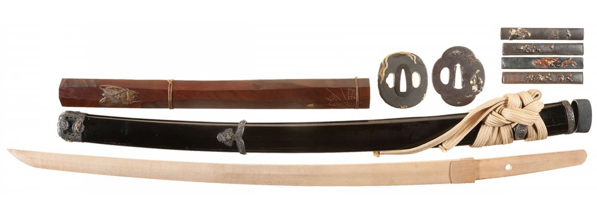 1) Black lacquer saya, with deeply cut flowers and fu dogs on the silver fittings, gold accents and a white silk cord, with a wood tsunagi (20 1/4 inch blade). 2) Hardwood saya for a diamond profile (moroha) blade, adorned with gold lacquer insect/sipder themes, as well as an 8 figure golden signature at the bottom. 3) Four kagatana hilts, 3 3/4 inches long each, with raised decorative inlays in a mixture of materials, including gold, silver and bronze. 4) Bronze fuchi with expertly darkened and beaded outer edge. 5) Iron tsuba, 4-lobed, with gold, silver and bronze inlaid and engraved scene of a man and woman with brooms standing underneath a tree while a crane flies overhead. 6) Oval soft metal tsuba, with gold and sillver accented scene of a ho-oh bird in flight over a tree in bloom.