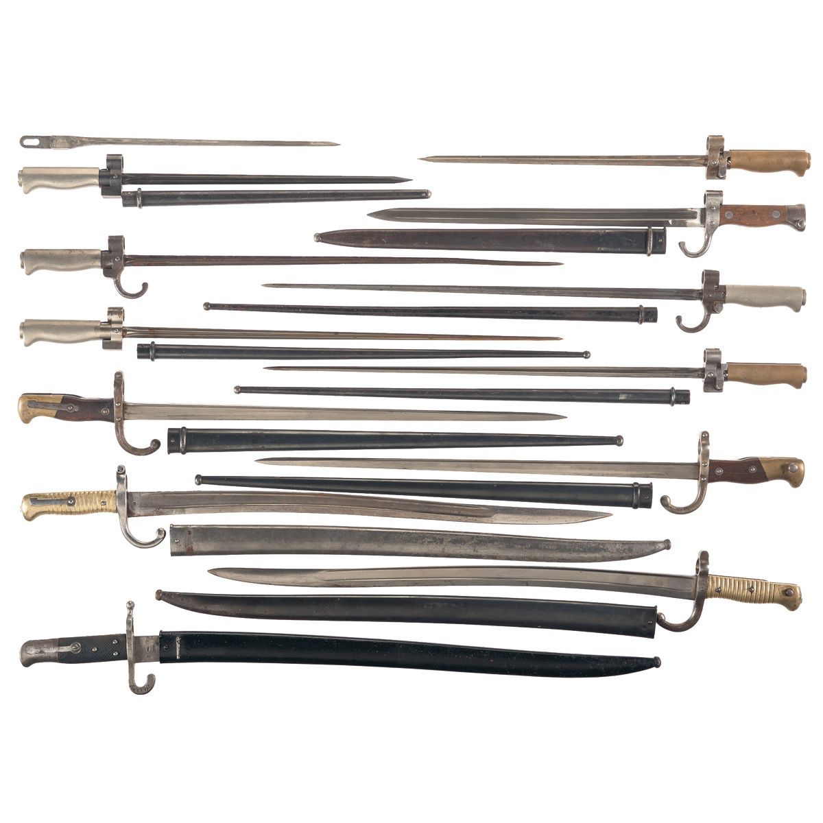 All have scabbards unless noted. 4 spike bayonets (1 without scabbard), spike bayonet without grip and no scabbard, 2 spike bayonets with a hook quillon (1 without scabbard), 6 bayonets with a hook quillon. Overall items are in good condition, some have been sharpened.