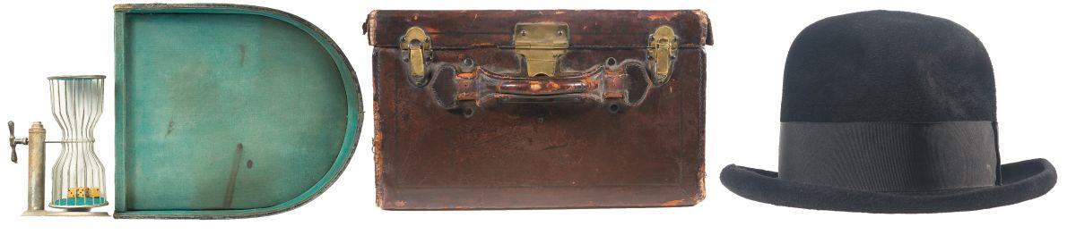 Chuck-aluz with stand and 3 dice, fine Stetson beaver bowler (size 6 3/4") in a fitted leather case (good) with silk lining holding a smaller red silk box fitted under the silk lining on the left side (contains an Oak Hall marked flat brush, suspenders, a black silk bow tie in its own box), antique bar top dice table (fine with some minor stains and minor wear).