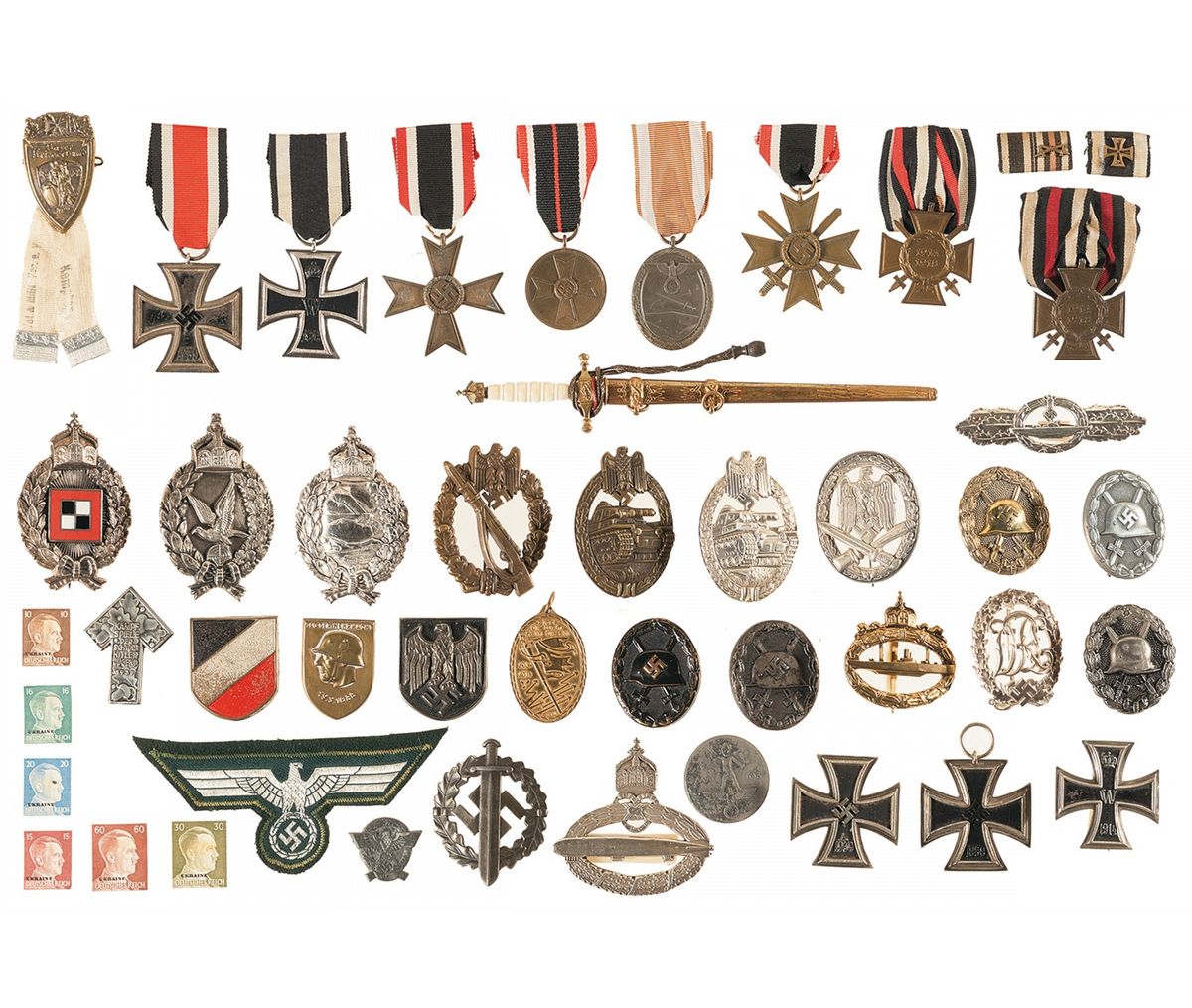 Includes Imperial Aviation Badges (Pilot, Observer, Aerial Gunner, and Zepplein), Nazi Wound Badges, (3 Black, 1 Silver, 1 Gold), Close Combat, Infantry Combat and Panzer (Bronze and Silver) Badges, Sport Badges, Bronze War Merit Crosses with and without Swords, 3 Second Class Iron Crosses and Two First Class Iron Crosses. Also included is a miniature Imperial Navy Dagger with ivory grip. Very good overall.