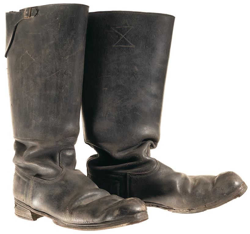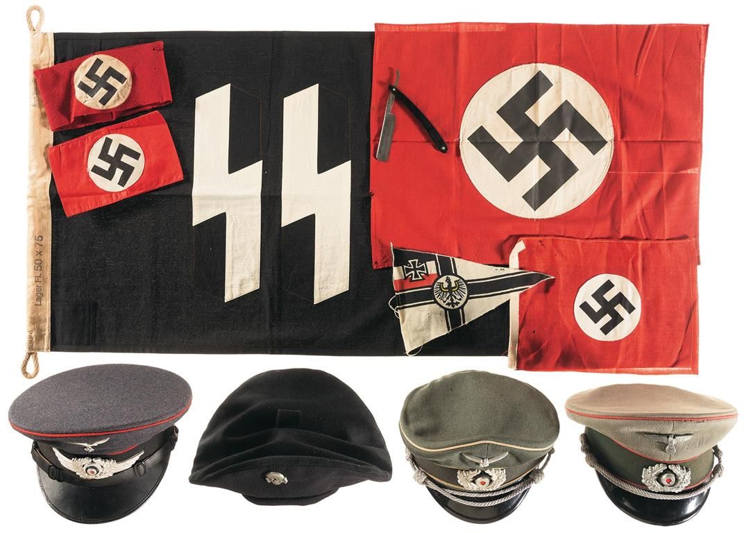 1) Pair of jackboots. 2) 1918 dated Wald-Solingen folding razor. 3) Death panzer type emblem on an Italian marked black beret. The inside of the beret is stamped "CPA/Pavia/58". 4) Luftwaffe flak artillery visor cap, Gustave Binner marking, size 56 1/2. 5) Heer artillery officer visor cap. 6) Heer infantry officer visor cap. 7) Two Nazi swastika arm bands. 8) Small Imperial German pennant. 9) Nazi flag, 10"x14 1/2". 10) Small swastika flag, 11 1/2"x8". 11) SS flag, 30"x20", marked "Kurt Brautigam/Plauen I. Vogtl."