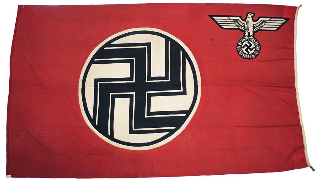 One large Nazi German naval proofed Reich State flag (very good with sewn tears), one German standard M42 helmet with no decals (poor to fair), one German M42 helmet with National Colours Shield and German Army decals (very good), and one German pickelhaube (poor condition).