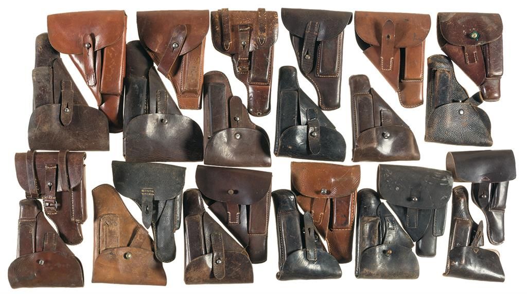 Lot contains 24 leather holsters mostly for German WWII era pistols such as Mauser, Walther, Sauer. Along with a Solingen pocket knife. Overall in good condition.