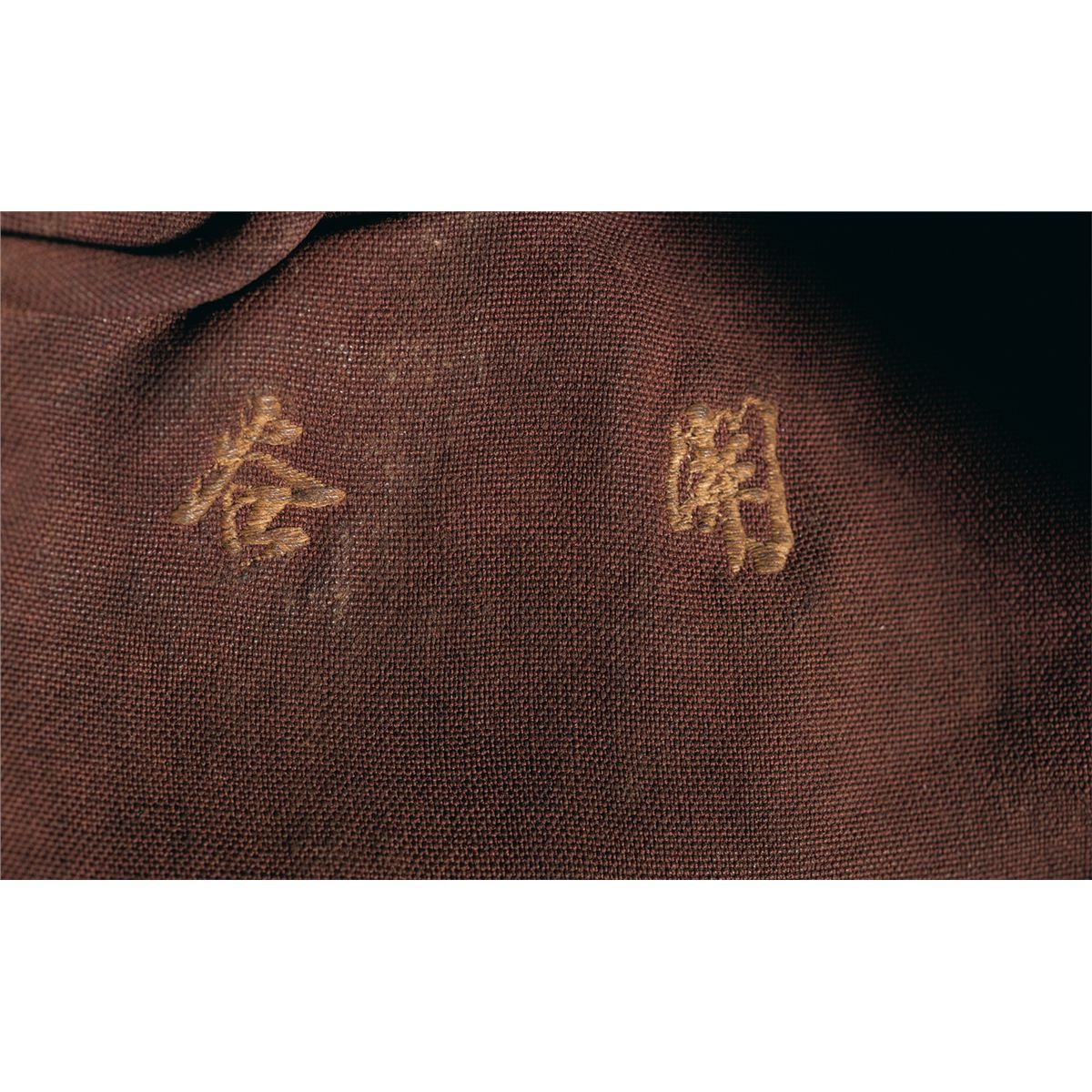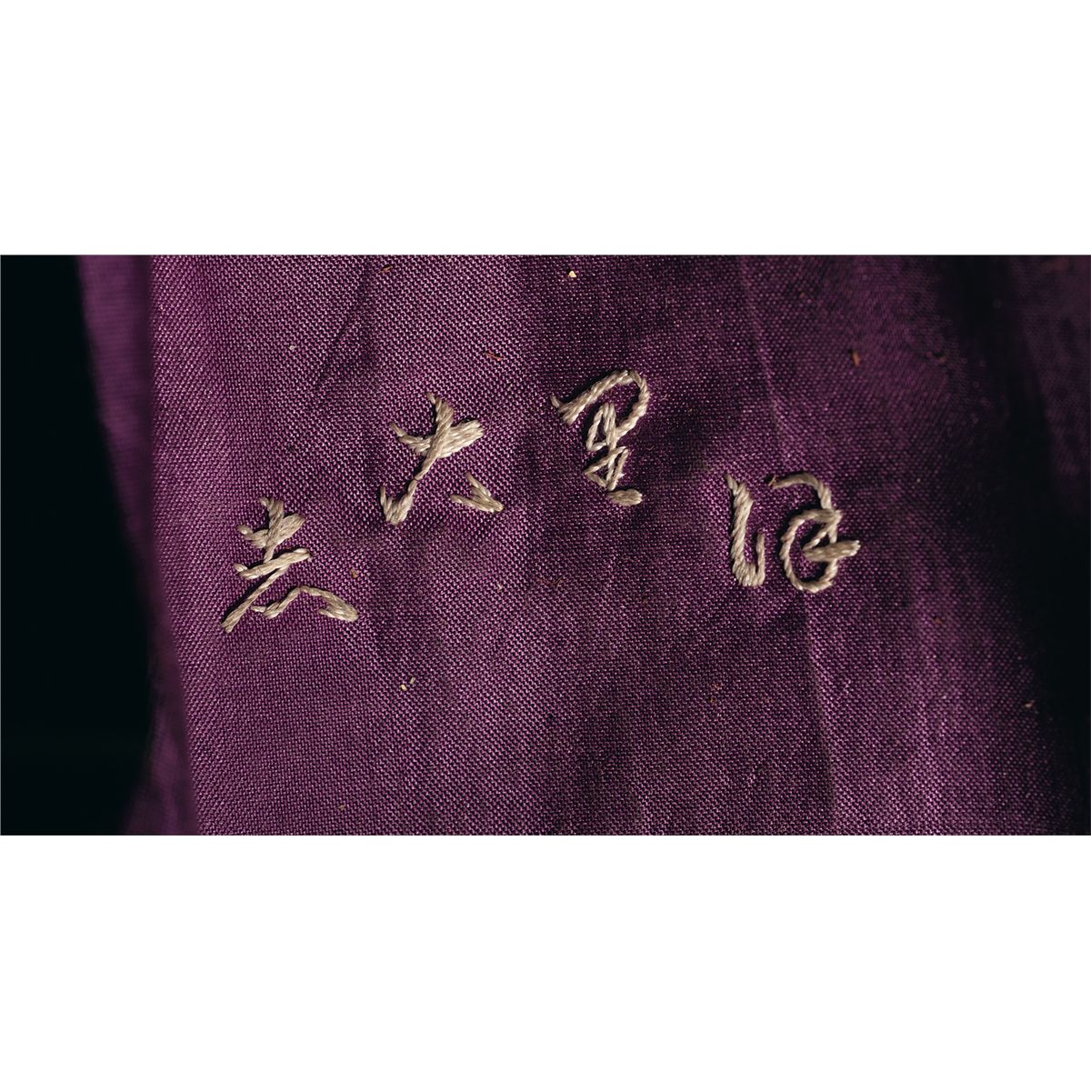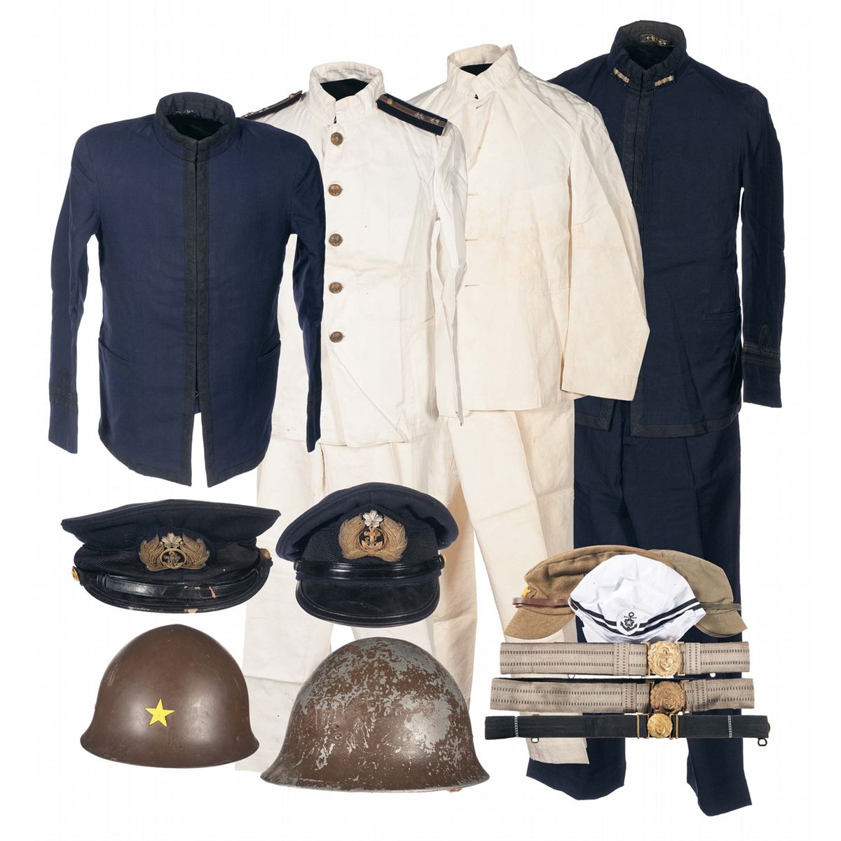 1) Imperial Japanese (IJN) Navy Lieutenant (Kaigun Daii) tunic, deep blue fabric with black ribbon trim and sleeve rank insignia. 5 small figures have been stitched into the inside of the collar. 2) IJN Lieutenants tunic, as 1 with the addition of collar tabs bearing three mum blossoms, and a 4-symbol makers label inside the collar. With matching colored trousers. 3) White tunic, with a 2 Kanji-symbol tag on the inside. No buttons. With trousers. 4) White tunic, with gilt brass anchor buttons and 2-mum shoulder boards. With trousers. 5) Two Japanese Navy belts, with gilt buckles and silver wire embroidered black belts, with concealed sword hangers. 6) IJN cap, white with black ribbon trim, white fabric chinstrap, and naval patch on the front. 7) Belt, brass buckle with black fabric belt and brass hangers with lion face designs. 8) Two Japanese Army caps, green with leather chinstraps. One has a yellow cloth star patch on the front. 9) IJN cap, black fabric with metal mum and anchor badges, bullion wreath, gilt brass chinstrap buttons, black leather chinstrap, and purple silk lining with 4 embroidered symbols. 10) IJN cap, as 9, with 2 symbols on the brown lining. 11) Japanese helmet, steel construction with brown finish, a yellow painted star on the front, and brown leather inner webbing. 12) Helmet, brown painted alloy, with green canvas chinstrap and leather webbing.
