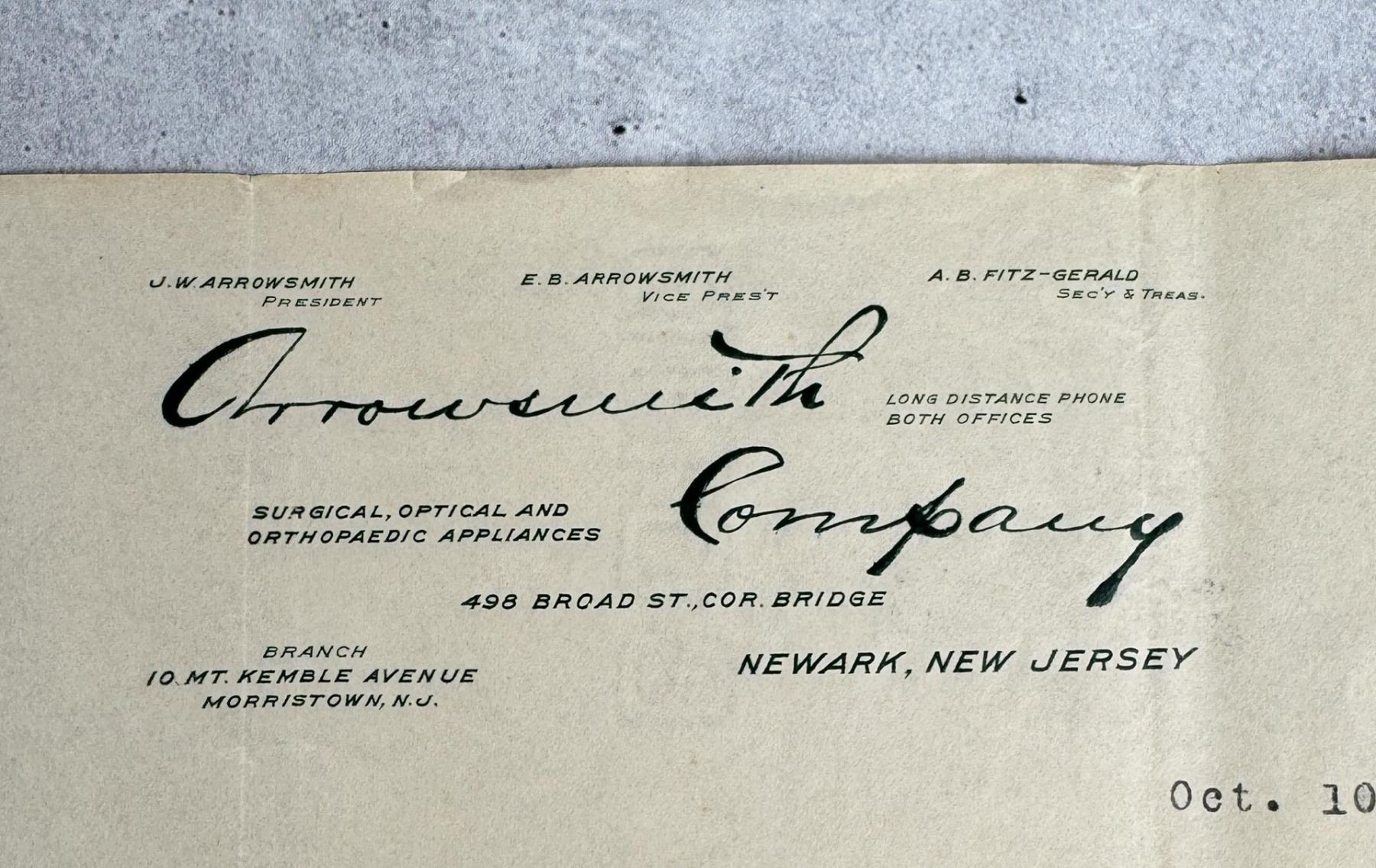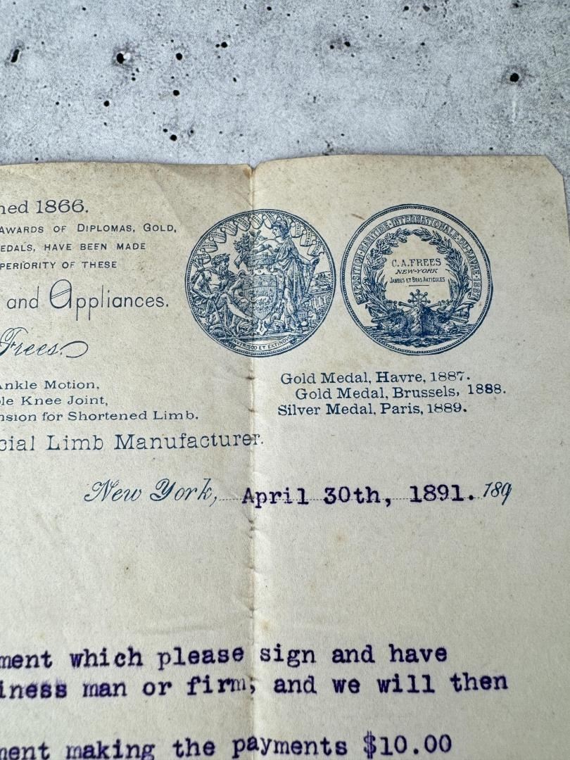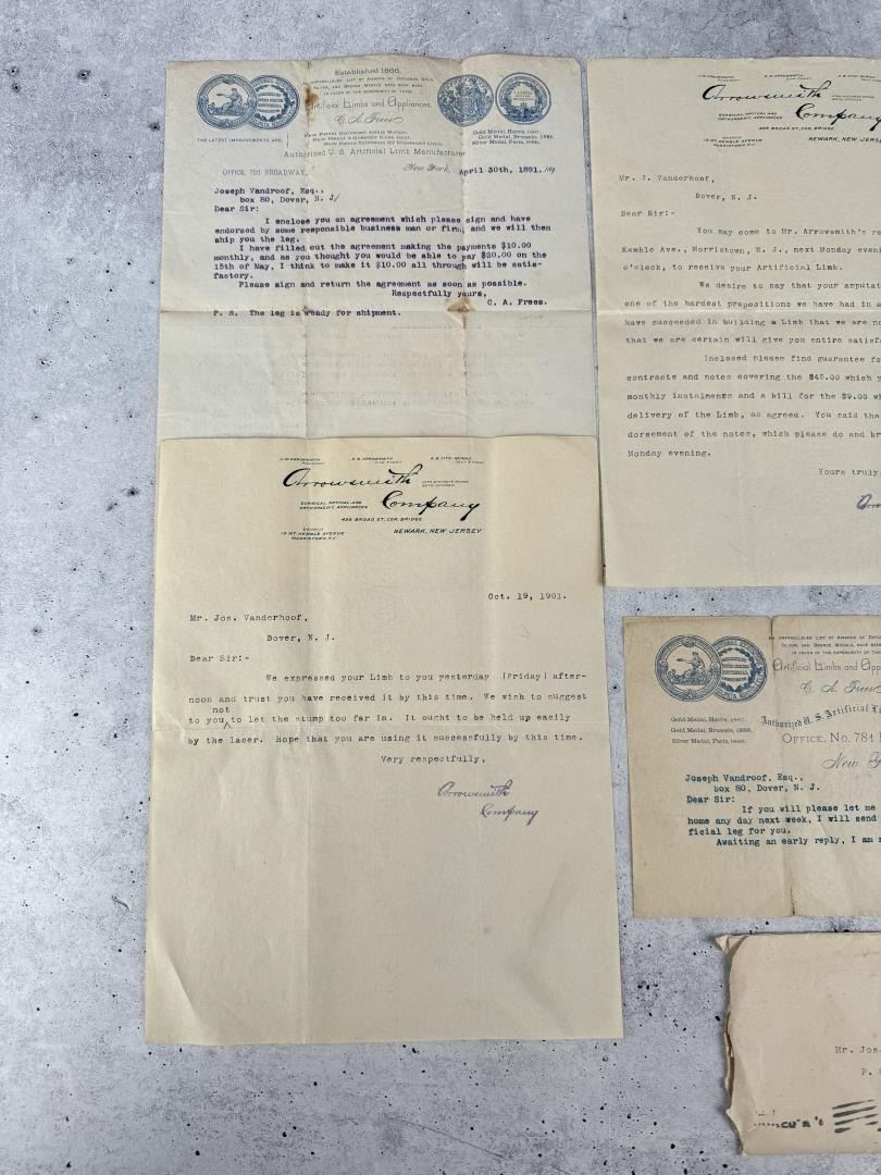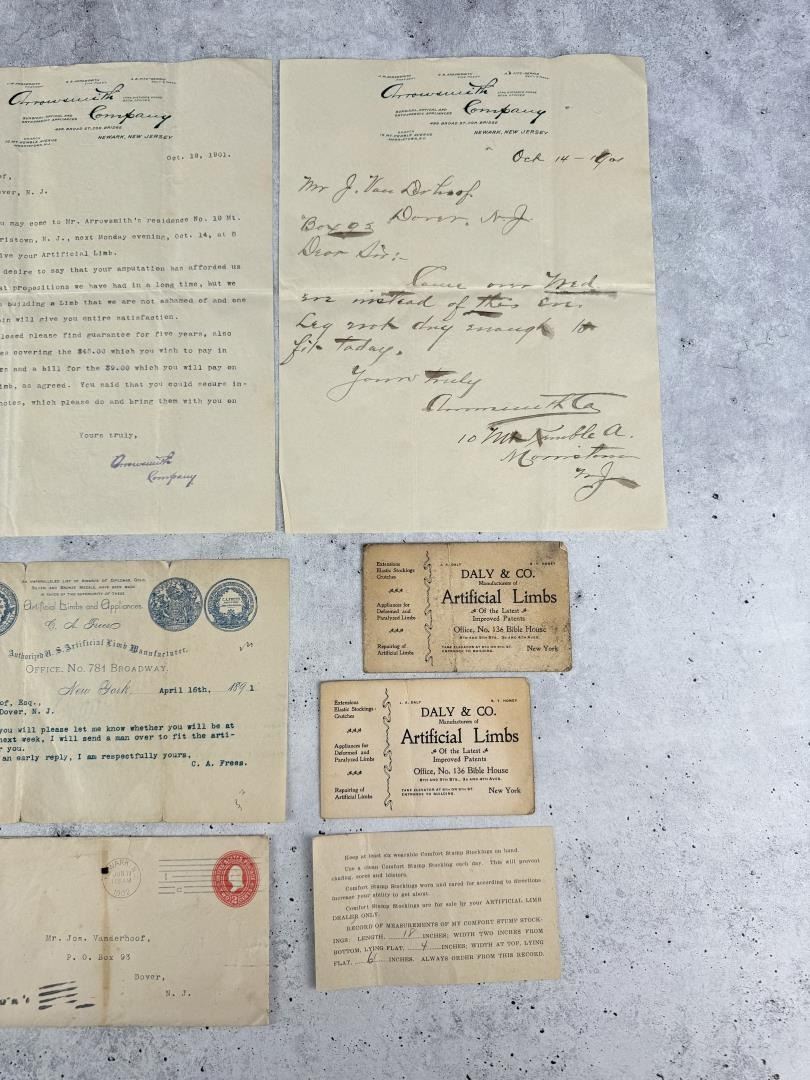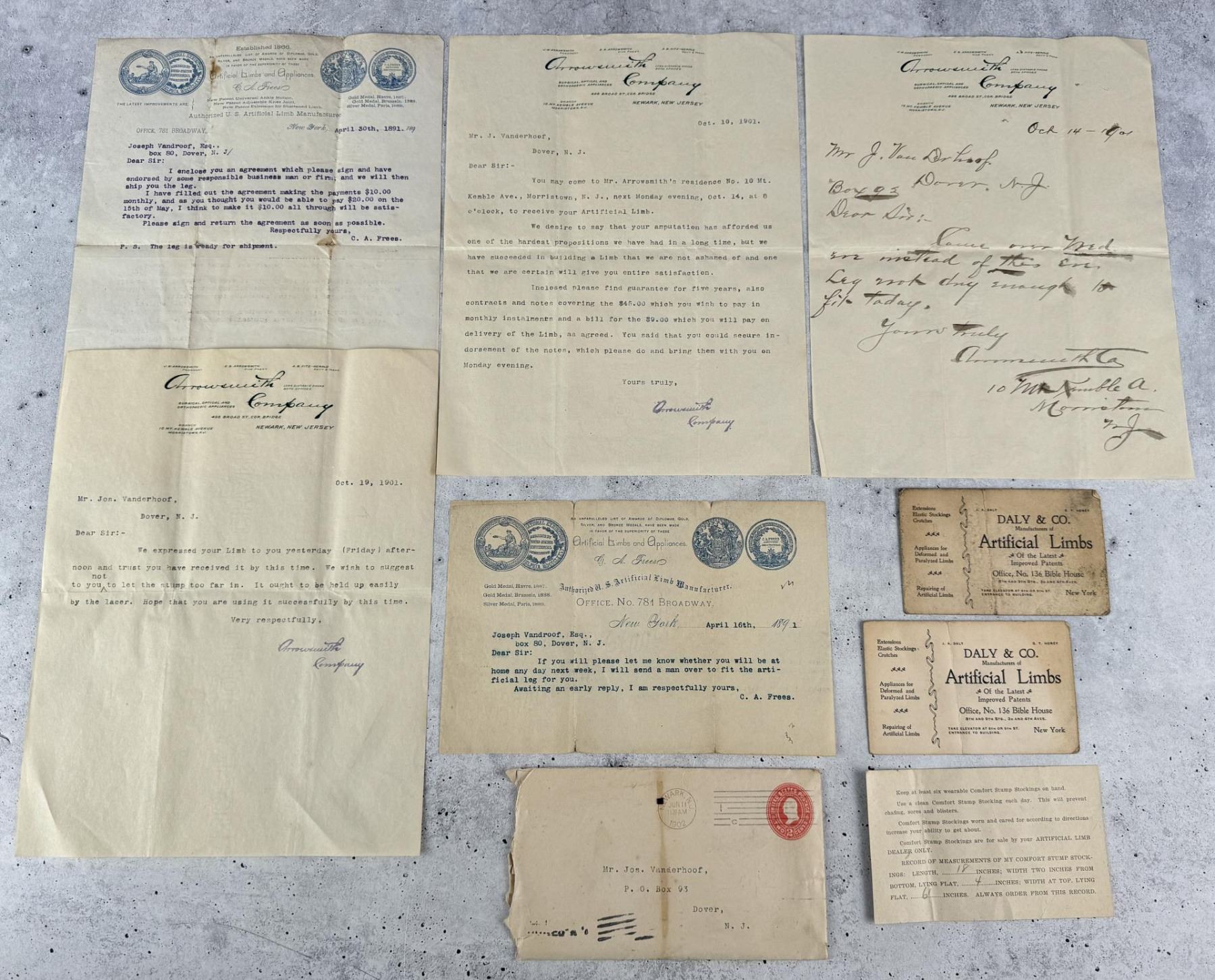 Letters and agreement of a new artificial leg for a Joseph Vandroof, New Jersey at the turn of the twentieth century. Neat early grouping of letters regarding early prosthetics.