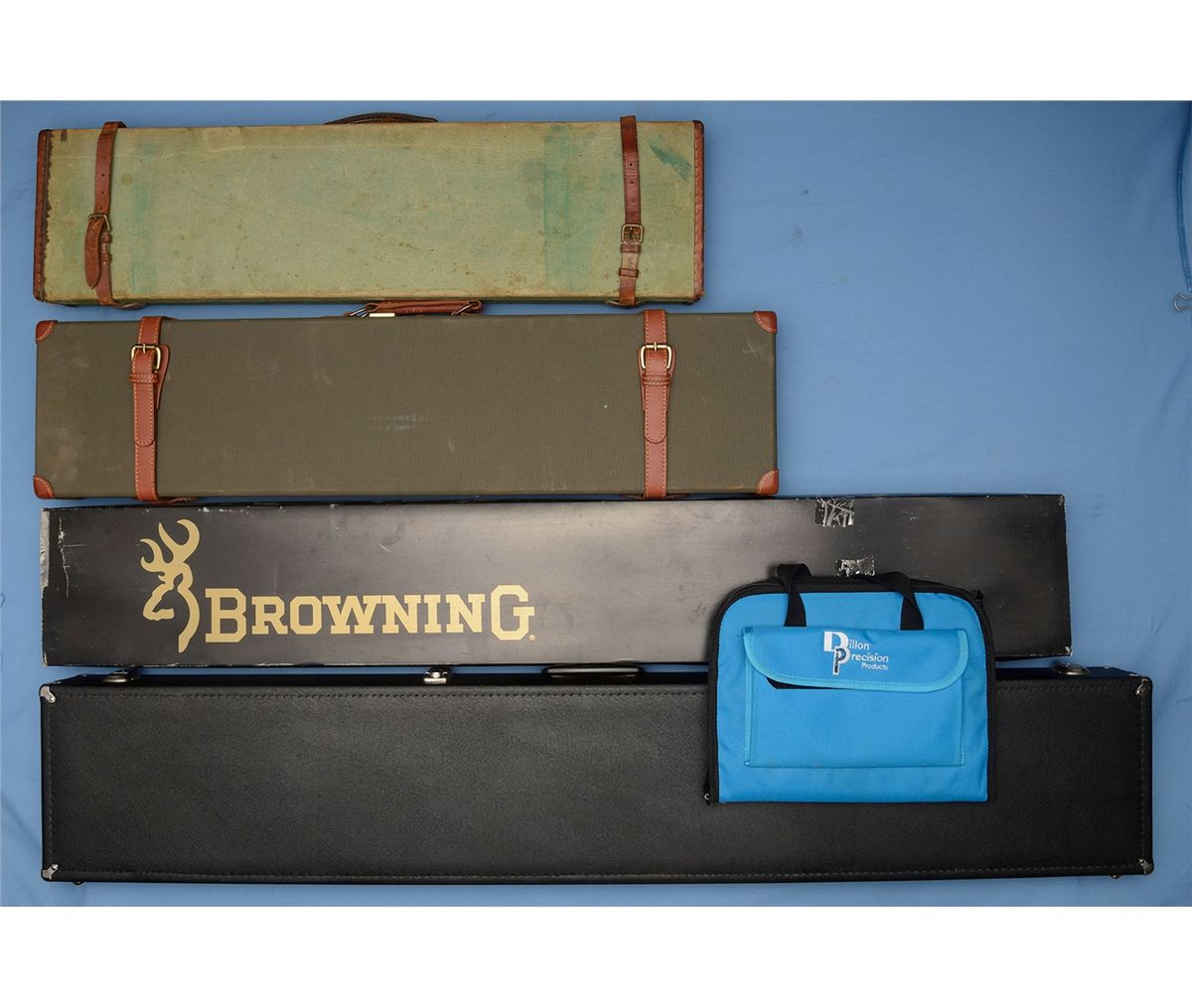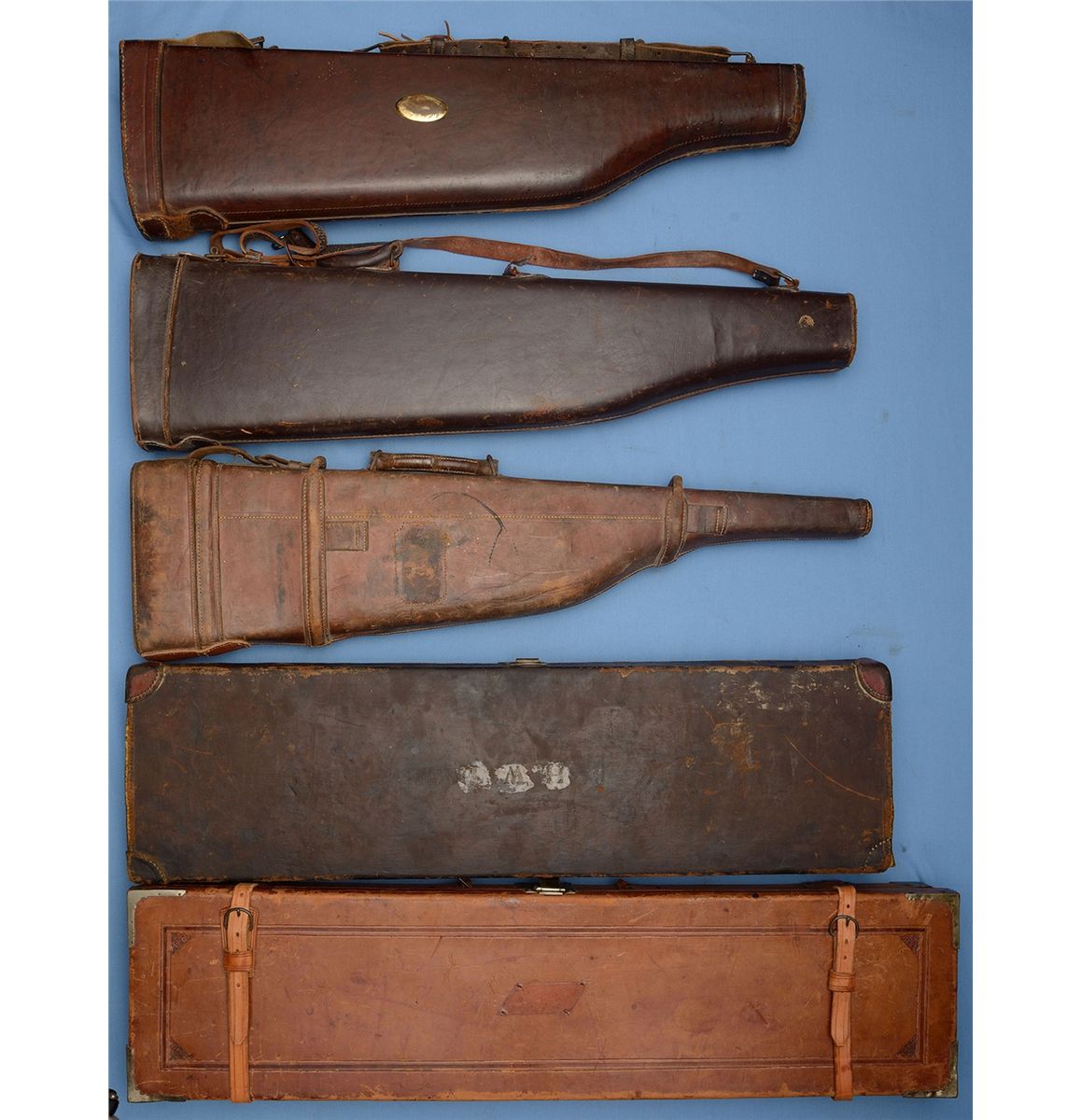 3 leather mutton cases, 1 Browning model 1855 box, 5 hard cases (2 leather), and 1 soft hand gun case. CONDITION: Fair or better overall.