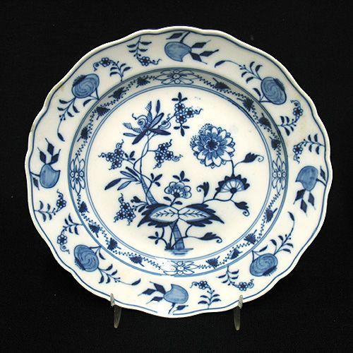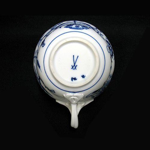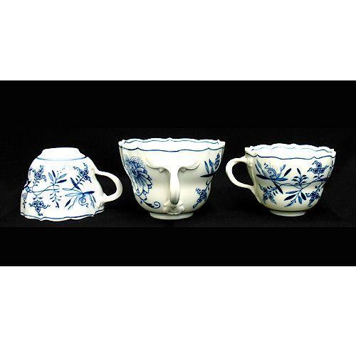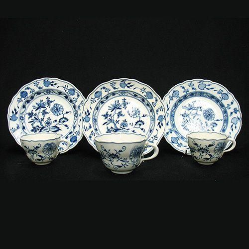 Grouping of Meissen blue onion including three 7 1/2 inch plates and three teacups; one 2 3/4 inches high and two 2 1/2 inches high (one with rim flake); all with crossed swords mark on bottom