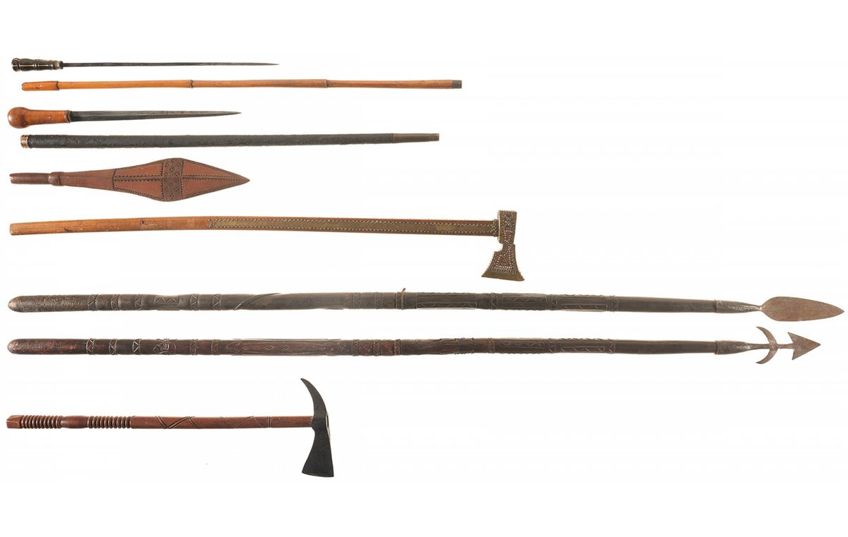 1) Dagger cane, 36 1/2" sheathed, 20" drawn, 16 1/2" blade, silver collar, faux-bamboo shaft and an ebony, ivory and pearl hilt. 2) Dagger cane, 35 3/4" sheathed, 17 3/8" drawn, 12 3/4" blade, gilt throat, leather covered shaft and wood hilt. 3) Wooden club, 18 1/4" long, 14" diamond "blade" with geometric designs. 4) Ceremonial axe, brass shod wood with bead accents, 38" long with a 3 1/4" wide head. 5) Spear, 62 1/2" long, 6 1/2" leaf shaped blade, carved 2-piece shaft. Joint damaged, otherwise fair. 6) Spear, 60 1/2" long, 3" broadhead tip with catch hooks, 2-piece shaft with carved tribal designs. Shaft joint broken, otherwise fair. 7) Hatchet, 24 1/4" long, 2 1/2" wide blade with 2 3/4" back hook, carved hardwood shaft. Good overall, with exceptions noted.
