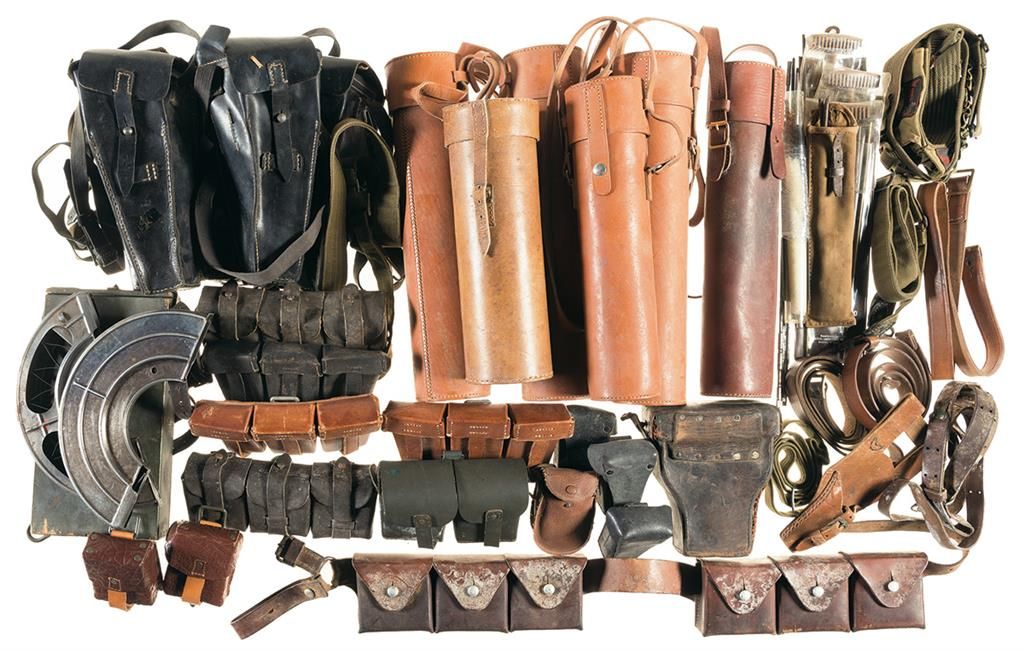 26 various leather cases and pouches, 3 rifle cleaning rod kits, 5 miscellaneous cleaning rods and one brush, one cleaning rod with canvas pouch, grouping of leather and canvas straps and belts, and two magazines for a French Chauchat Model 1915 light machine gun with wood carrying case.