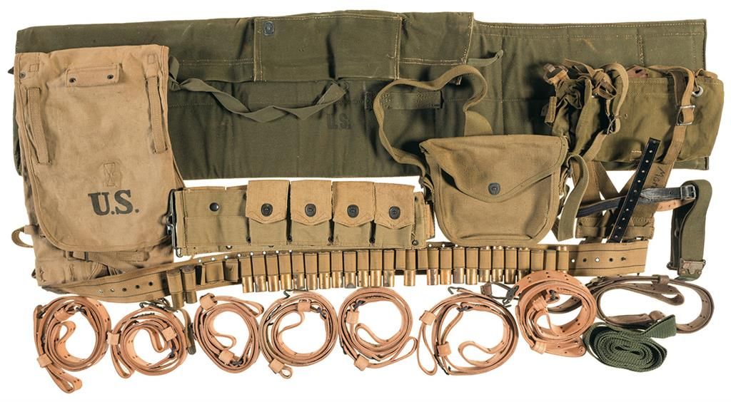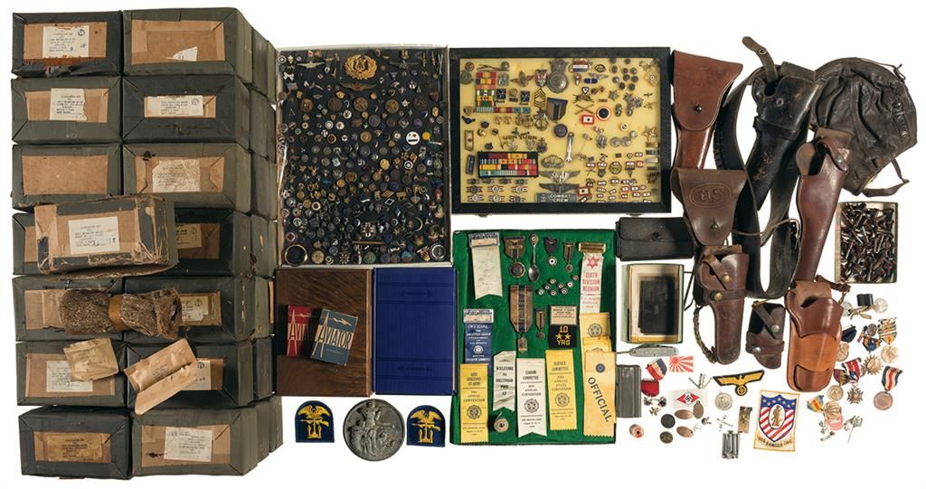 1) 8 leather slings, approximately 43 field lube kits for mechanism AN-M2, "LONG 8-18" marked ammunition belt, shotgun shell belt, U.S. canvas gun carrying case, 3 canvas pouches, collection of pins to include clubs, unions, and other organizations, American Legion items (7 pins, 5 medals, and 12 ribbons), other pins and badges (to included 2 bombardier wings, many service stars, service ribbons, "E" pins, ruptured ducks), 3 glass plate negatives, wooden case with "ERIC" marked initial plate, 3 WWII ration books, Striegel & Wagner leather flight helmet, 2 Aviator decks of playing cards, box of photo negatives, Challenger leather holster rig, 2 U.S. leather holsters, 4 leather commercial holsters, 2 books (McLean's (editor) MAXIM MACHINE GUN M1904 and U.S. ARMY REGULATIONS 1916), M1 carbine magazine, front sight cover 2) Framed display titled "Presidents of the United States of America, featuring a reproduction of the Presidential seal next to a photograph of unknown vintage, featuring (from left to right) George H.W. Bush, Ronald Reagan, Jimmy Carter, Gerald Ford and Richard Milhouse Nixon. Frame measures 22" wide, 14 1/4" tall. 3) Medal of Merit for Ronald Reagan's Republican Presidential Task Force, 2" diameter gold toned metal with a blue velvet presentation case. 4) Book, "Reagan" by Lou Cannon, printed in 1984. Very good, with "P" ink stamped on the lower edge of the pages.