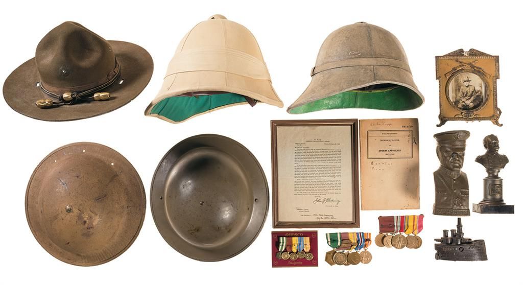 2 pith helmets, campaign hat, 2 Brodie helmets, May 13, 1942 dated TM 21-220 Sports and Games Technical Manual, WWI picture frame with photo, Gen. Pershing bank, service medals (American Campaign, China Service, WWII, National defense), service medals with corresponding miniature medals (Merit, American Defense, American Campaign, Asiatic Pacific Campaign), USS Oregon bank, small bust of Admiral George Dewey, framed February 28, 1919 dated letter of service termination, 2 Army uniform trousers, Army uniform jacket.