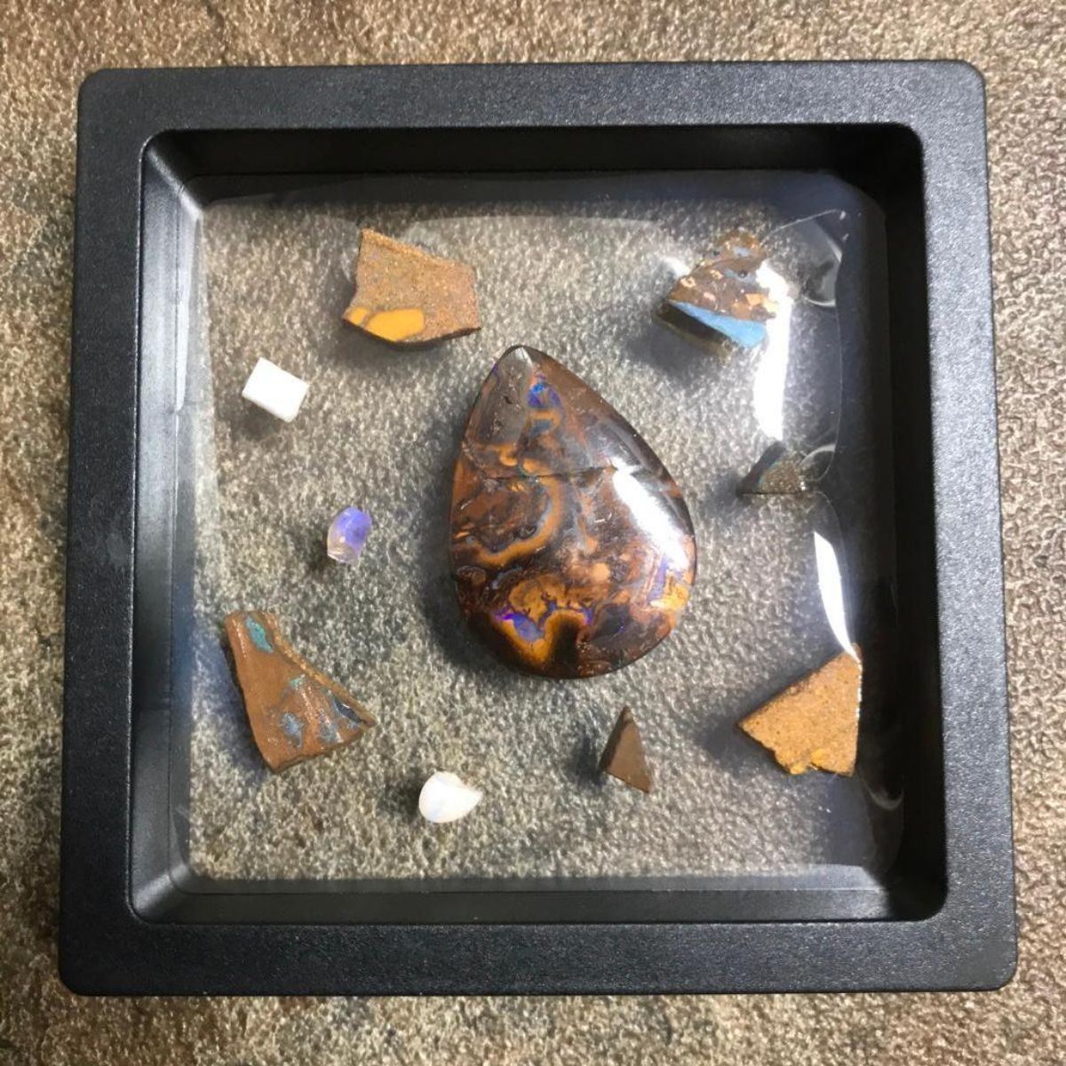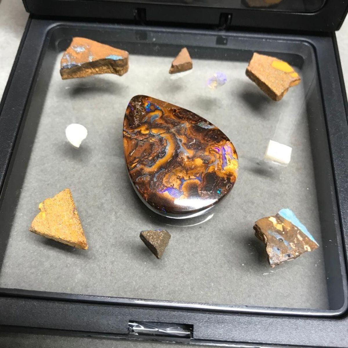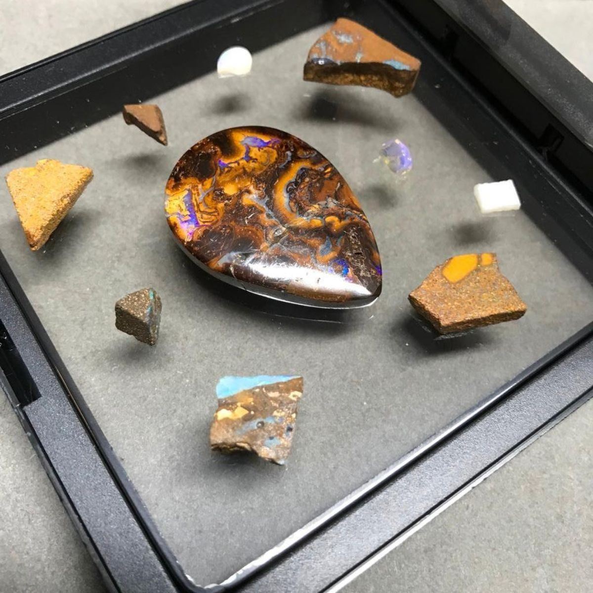 Grouping of opal gemstone fragments including - 46.4ct teardrop polished Australian boulder opal with a crack across the middle front & 21ctw of miscellaneous tiny rough opal chips, together in a small display case.Â