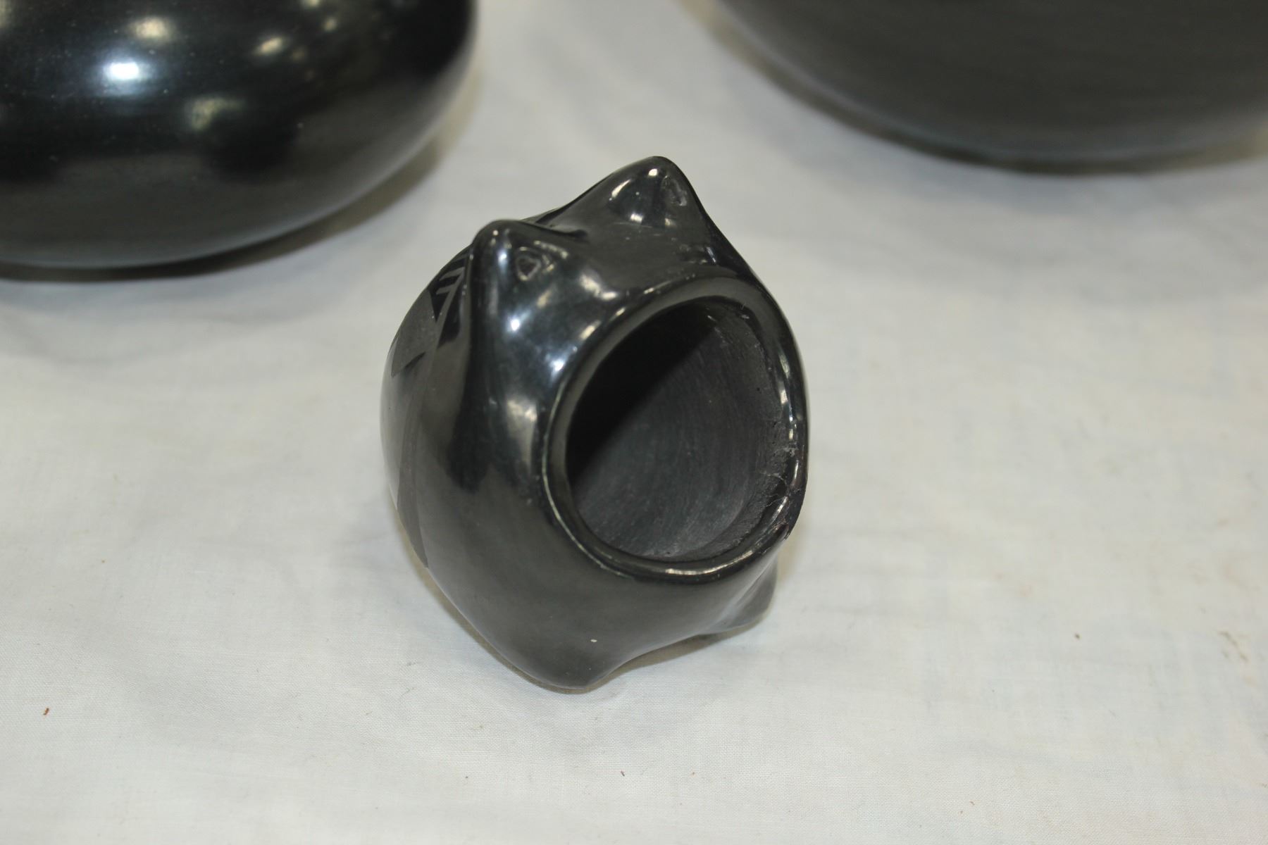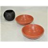 Group of 6 Native American pottery pieces, 1) Frog 3"x 3", 2) 3"x 6" bowl, 3) 3 1/2"x 4" incised pottery jar, 4) 6"x 5"x 3" incised wedding vase, 5) 6"x 8" pottery jar, 6) pair of Hopi Indian pottery bowls measuring 2"x 5 1/2".