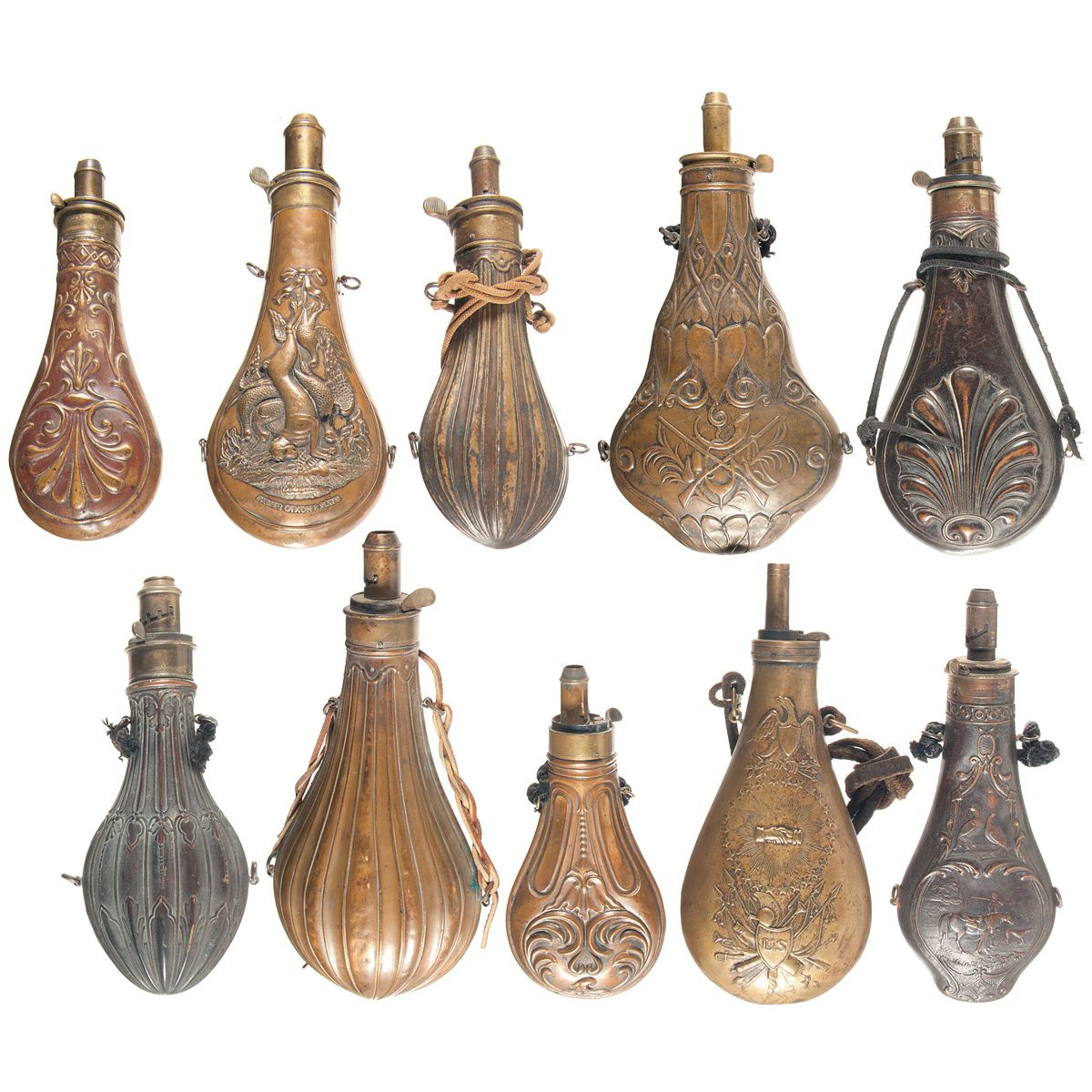 1) Unmarked, double face ornate design. 2) Dixon & Sons, single face hunted game scene. 3) Unmarked, fluted. 4) Unmarked, double face ornate motif. 5) W. Bartram, double face shell motif. 6) Unmarked, fluted, floral motif. 7) Unmarked, fluted. 8) Unmarked, double face floral scroll motif. 9) Unmarked, double face peace flask motif. 10) Unmarked, floral and hunting scene motifs, double face. Very good overall with a few having broken spout springs.