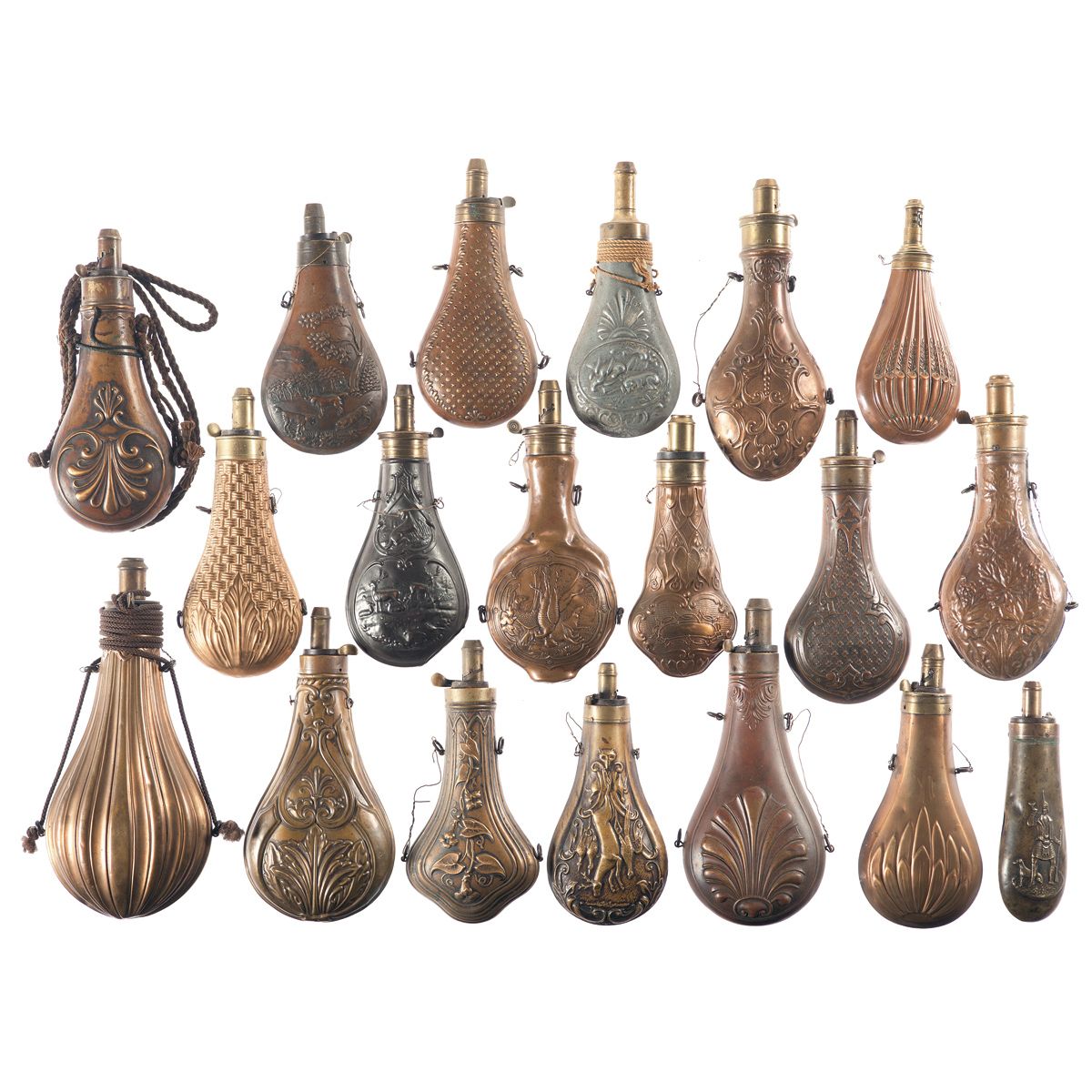 1) Am. Flask & Cap Co. double face shell pattern. 2) Dixon & Son, double face leaf and blossom vine design, broken spring. 3) Dixon & Son, double face basket weave and floral design. 4) Unmarked, double face stag and dog scene. 5) Unmarked, double face with oak leaf design on one side, and game birds on the other, repaired seams. 6) Unmarked, double face ornate design incorporating vines. 7) Hawksley, fluted. 8) Dixon & Son, double face star and dot pattern. 9) Unmarked, double face hunting dog scene. 10) Unmarked, double face hunting dogs scene, split seam. 11) Hawksley double face ornate design with heads of horses on one side. 12) Unmarked, double face game scene. 13) Hawksley single face hunting dog and game scene. 14) Batty, double face lotus design. 15) Hawksley, double face ornate design. 16) Unmarked, double face hunter and dog scene. 17) Hawksley double side shell type pattern. 18) Dixon & Son, double face ornate design incorporating floral blossoms. 19) Unmarked, double face ornate design, loose spout base. Overall powder flasks are good or better with a few having some dents.