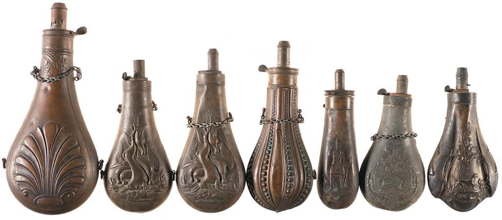 1) 10", double face shell pattern. 2) 7 1/2", single face game scene. 3) 8", double face fluted and dot pattern. 4) 6 1/2", double face scroll and rabbit scene (split seam). 5) 7 3/4, double face game scene. 6) 6 3/4", double face hunter with dog scene. 7) 7", doube face scroll and dog scene. Fair to good.