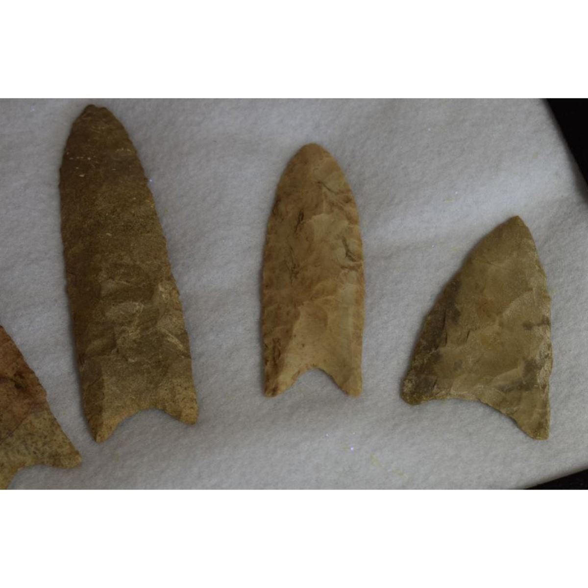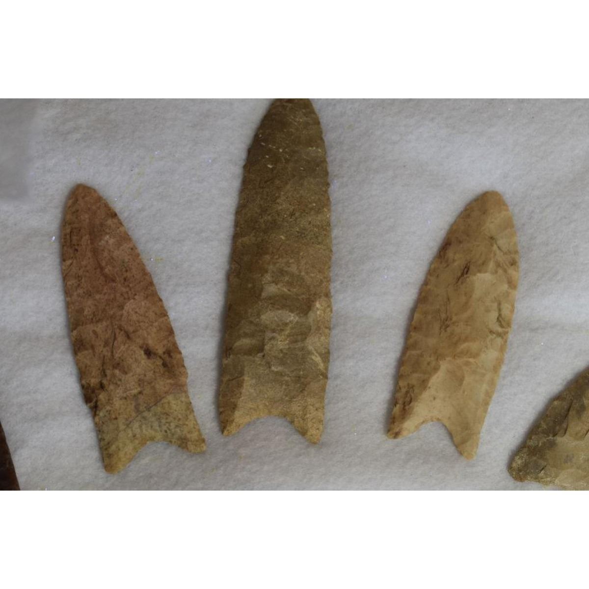 Grouping of 5 Native American prehistoric Clovis Points, arrowhead  projectile points in museum frame. 9860-030518-PB-00170