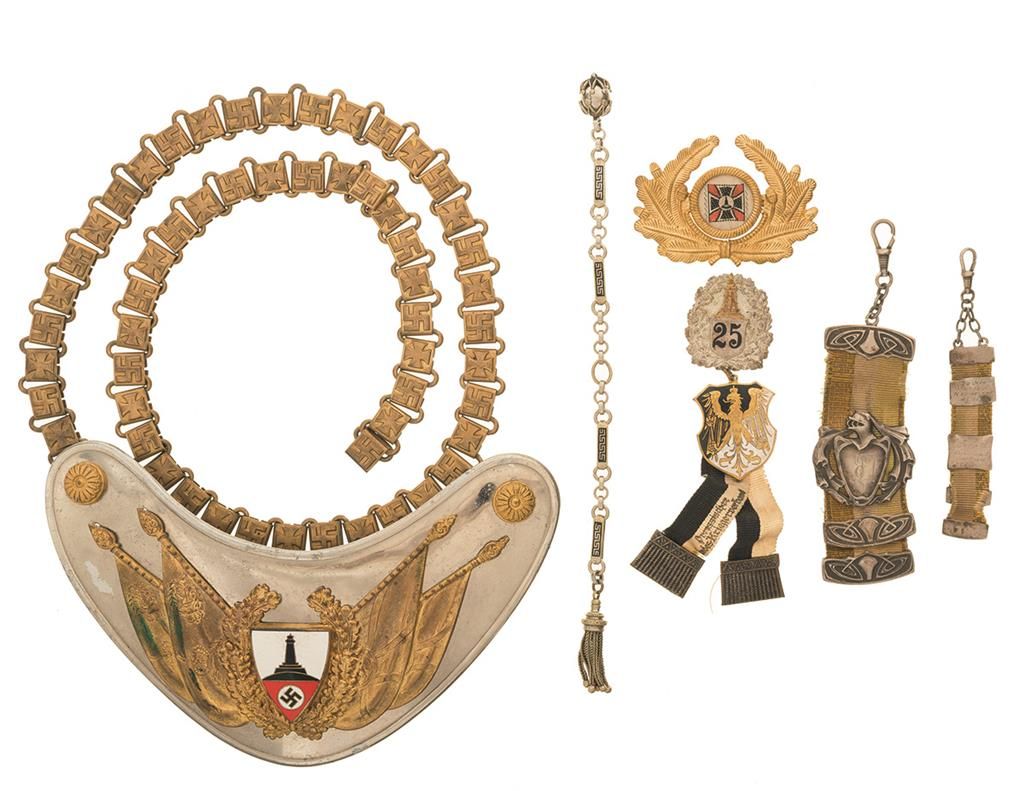 1) Kyffhauserbund gorget, 6 1/2" wide, with gilt brass chain. Good. 2) Two silver-fitted ribbons, yellow white and gold tricolor with 1928 dates and unidentified monograms. Good. 3) Kyffhauserbund hat badge, 2 3/8" stamped brass construction with cloth Kyffhauser symbol. Fair, mild bending. 4) Prussian Land-fighter League ribbon, with "25" badge, black and white ribbons and gilt Prussian eagle. Good. 5) Silver chain, 7 1/2" long, with ball tipped tassels on one end and black enamel accents. Good.