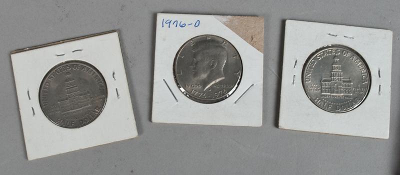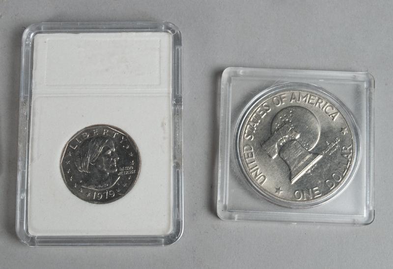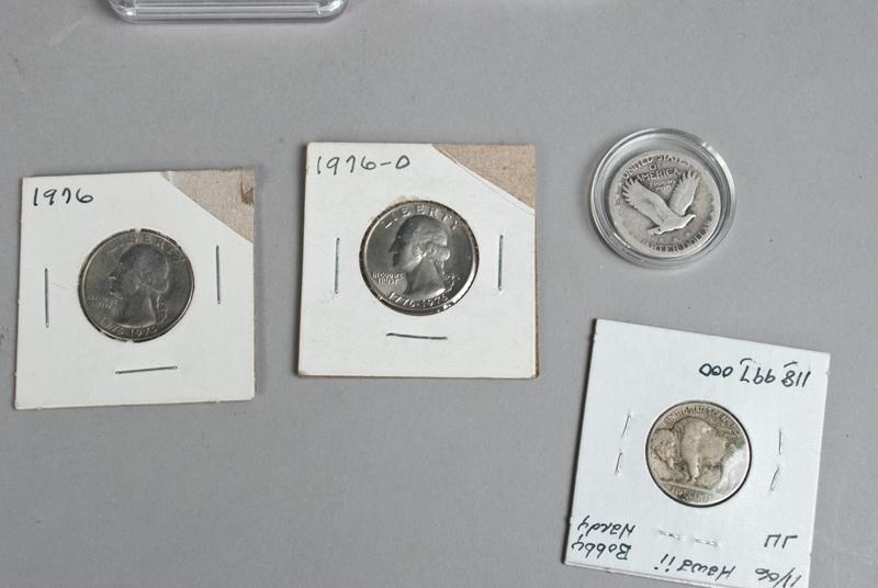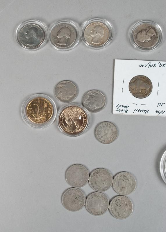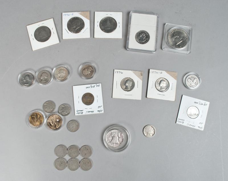 Includes four silver quarters, six V nickels, five buffalo nickels, four half dollars, two dollars, three 1976 quarters, a Martin Van Buren gold dollar, a Nebrask 2006 gold quarter, and a shield nickel with date rubbed off.