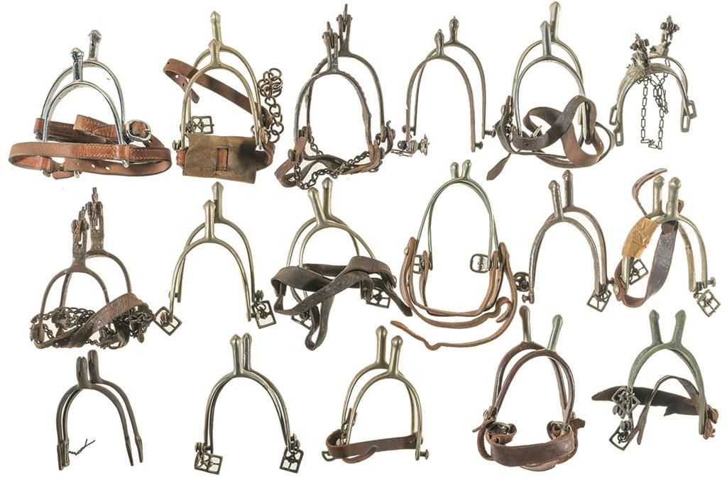 Approximately 18 sets of spurs. Includes Waterford style with different shaped tips and rowelled style with different rowel sizes and point counts. Some have minor decoration and all attach with leather straps (straps mostly absent).
