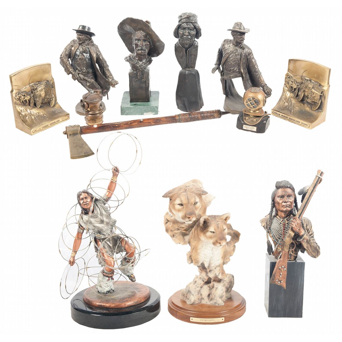 Statues: Legends "No More, Forever" (579/950, few dings on hair), Legends "Hoop Dancer" (254/750) , mountain lion "Intrusion" (one of 4000), Frederk Remington's cowboy bust, Mark Hokins' 1991 two dueling gunslingers (both 59/150), Robert Burns Wilson's 1974 Native American bust, miniature diving helmet with bass ivory plaque marked "A.T. HAYNES/WRECK 'MARIA'/MAY 1892". With British brass head trade tomahawk (circa 1800-1840), Wells Fargo Overland Stage bookends and Autolite carbide lamp.