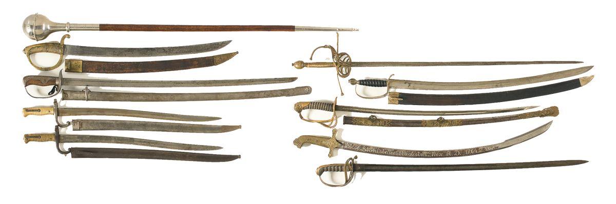 1) Band leader baton, 46" tall, 4" diameter nickel ball head. Some dents and cracks. 2) Short sword, 23" curved blade, "86" marked solid brass hilt, and brass fitted leather sheath. 3) Japanese sword, 32 1/2" single fuller blade, metal guard with wood grip, leather finger loop and metal sheath. Blade is pitted. 4) Bayonet, 22 1/2" single fuller yataghan blade, iron guard, brass hilt and metal sheath. 5) As 4, with "13.L.I.2.92" unit mark on guard. 6) Rapier, 33" etched single fuller blade, brass basket guard and brass hilt. 7) Sword, 28" curved unmarked double fuller blade, brass guard, wire wrapped grip and leather and brass sheath. 8) Knights of Pythias fraternal sword, 27 7/8" etched single fuller blade, "Carl Schad." on one side, brass hilt, rayskin grip, brass fitted metal sheath. One hanging ring welded back into place. 9) Polish honor sword, 31" curved blade with royal marking and "AD 1764" on side, brass mameluke hilt and wood grips. 10) W. Clauberg (Solingen) sword, 32" single fuller blade, cut-through brass guard, and wire wrapped rayskin grip. All items are fine or better, with noted exceptions.