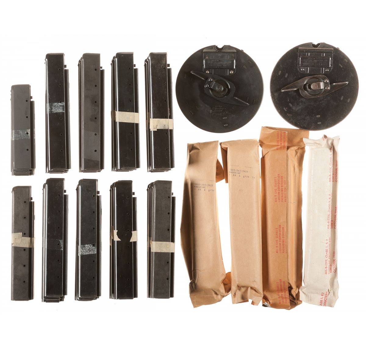 Two ammunition cans containing approximately 34 Thompson SMG magazines, mostly all U.S. military. 2 each pre-ban Auto Ordnance Type "L" 50 round drum magazines, 25 each steel 30 round magazines, 3 each steel 20 round magazine, 4 unopened 30 round magazines and two steel ammo cans.