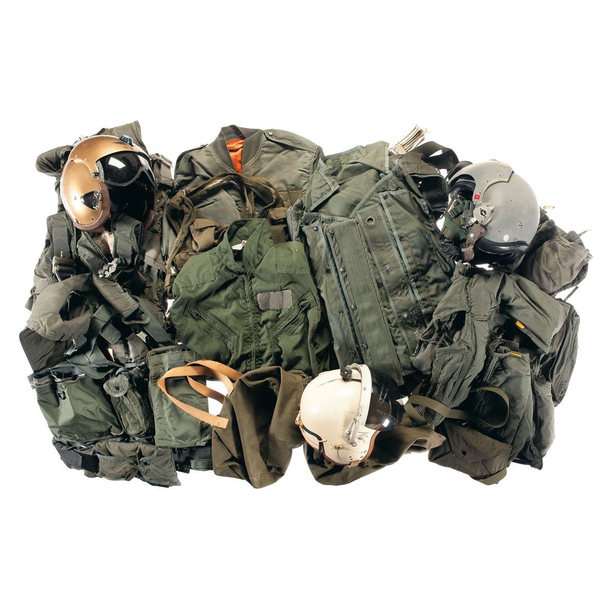 Included with the lot is a 1970 Mills parachute (canopy not included), OD green jumpsuit and jacket, two sets of anti-G force leggings, 2 torso harnesses, two inflatable life preservers, mesh survival vest and three helmets. One helmet is cracked, otherwise items are in good or better condition.