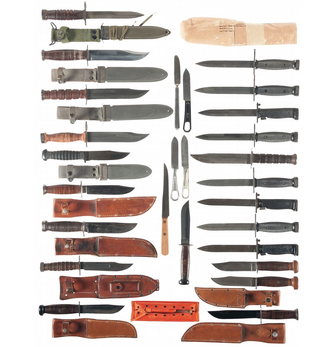 Bayonets and knives have scabbards/sheaths unless noted. Western fighting knife, 2 USN Ka-Bar MK2 fighting knives, Utica M4 bayonet, sealed M2 bayonet, USN Pal fighting knife (no sheath), Conetta bayonet (no scabbard), unmarked bayonet (no scabbard), 2 Colt M7 bayonets (no scabbards), TMN M4 bayonet (no scabbard), shroud cutter, Bren-Dan M4 bayonet (no scabbard), USN Pal fighting knife, Kinfolks fighting knife, Conetta M7 bayonet (no scabbard), Case "337-6Q" knife, J&D Tool M5-1 bayonet (no scabbard), USN MK1 Camillus fighting knife (no sheath), Colt M7 bayonet, J&D Tool M5 bayonet (no scabbard), Camillus survival type knife, USN Robeson No. 20 knife (no sheath), USN Colonial fighting knife, USN Camillus fighting knife, with 5 miscellaneous knives. Good to very good.