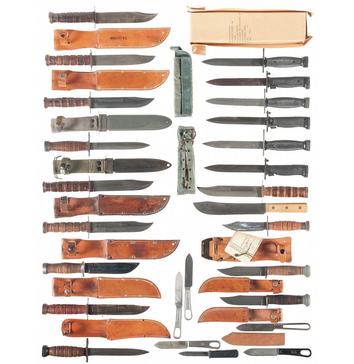 Bayonets and fighting knives have sheath/scabbard unless noted. 2 USMC Ka-Bar fighting knives, Utica Cut Co. fighting knife (no sheath), Case M4 bayonet, USN RCC MK2 fighting knife, USN Camillus MK2 fighting knife, Imperial M5A1 bayonet (no scabbard), Ontario M2 bayonet (no scabbard), M5A1 bayonet (no scabbard), Camillus M4 bayonet (no scabbard), Pal M4 bayonet (no scabbard), 2 shroud cutters, 2 USN Pal MK1 fighting knives, Cattaraugus fighting knife, type fighting knife manufactured in Japan, USMC Pal fighting knife, unmarked survival type knife, K-M4 bayonet (no scabbard), Imperial M5 bayonet (no scabbard), sealed M6 bayonet, with scabbard and 7 miscellaneous knives. Overall very good.