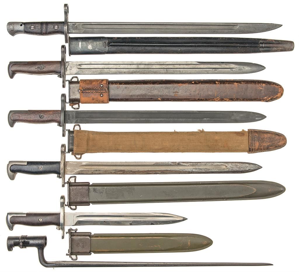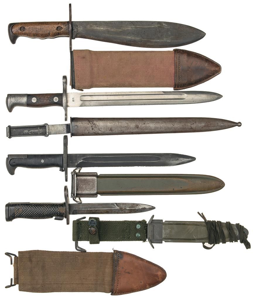 One Rock Island Arsenal made 1906 bayonet with scabbard, one Springfield Arsenal made 1906 bayonet with scabbard, one Remington made 1917 bayonet with scabbard, one American Fork & Hoe made US M1 bayonet with M7 scabbard, one Milpar Col made M6 bayonet with USM8A1 scabbard, one Plumb made M1917 bolo knife with sheath, one Model 1898 Krag bayonet with metal scabbard (Dated 1899), one Wilde Drop Forge & Tool made M1 bayonet with M7 scabbard, one Bauer Brothers 1918 bolo knife sheath, and one U.S. marked spike bayonet.