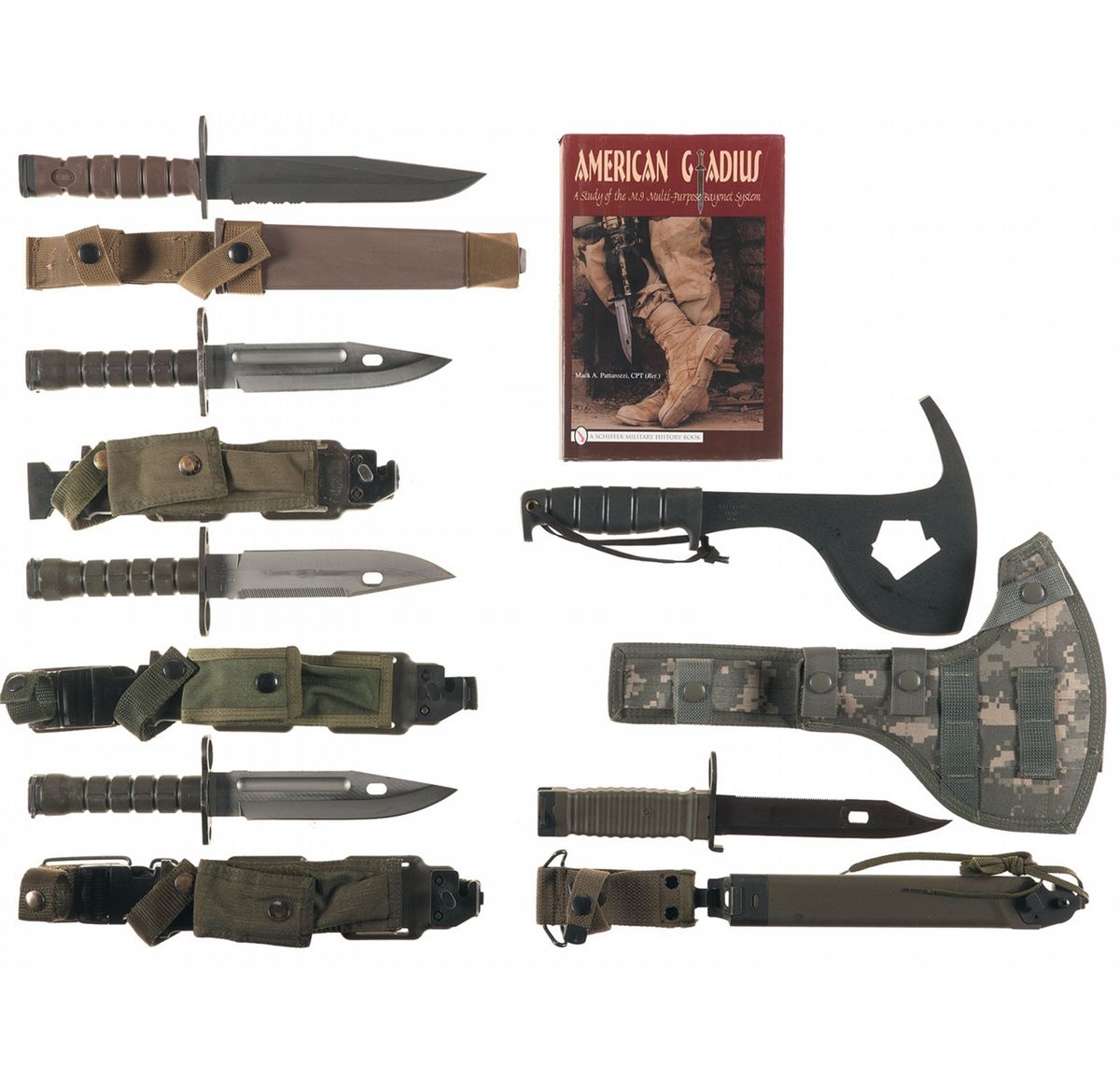 1) Ontario U.S.A. combat axe with 13" overall length with sheath. 2) Unknown bayonet with 6 7/8" blade with sawback blade and wire-cutting sheath. 3) U.S.M.C. Ontario bayonet with 8" blade and scabbard with sharpening stone. 4) M-9 "PHROBIS/III" bayonet with 7 1/8" blade and wire-cutting sheath. 5) M-9 "PHROBIS/III" bayonet with 7 1/8" blade and wire-cutting sheath. 6) M-9 "PHROBIS/III" bayonet with 7 1/8" blade and wire-cutting sheath. 7) Ontario rubber training bayonet with 8 1/8" blade. 8) Book entitled, "American Gladius: A Study of the M-9 Multi-Purpose Bayonet System" by Matt A. Pattarozzi, Captain, U.S. Army. (Ret) 9) U.S. Ontario "SPEC/PLUS" combat axe, 13" overall with nylon sheath. 10) M-9A1 "PHROBIS III" bayonet with 7 1/8" blade and plastic scabbard with sharpening stone. 11) M9 "PHROBIS III" bayonet with 7" blade and plastic scabbard. 12) USMC M-9 bayonet with 7" blade and plastic scabbard. 13) M-9 "PHROBIS INT'L" bayonet with 7" blade and plastic scabbard. 14) M-9 "PHROBIS III" bayonet with 7 1/8" blade with plastic scabbard. 15) Ontario Model 1 rescue tool with instructions and sheath. Very good to excellent overall.