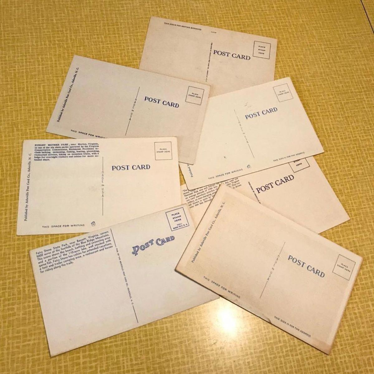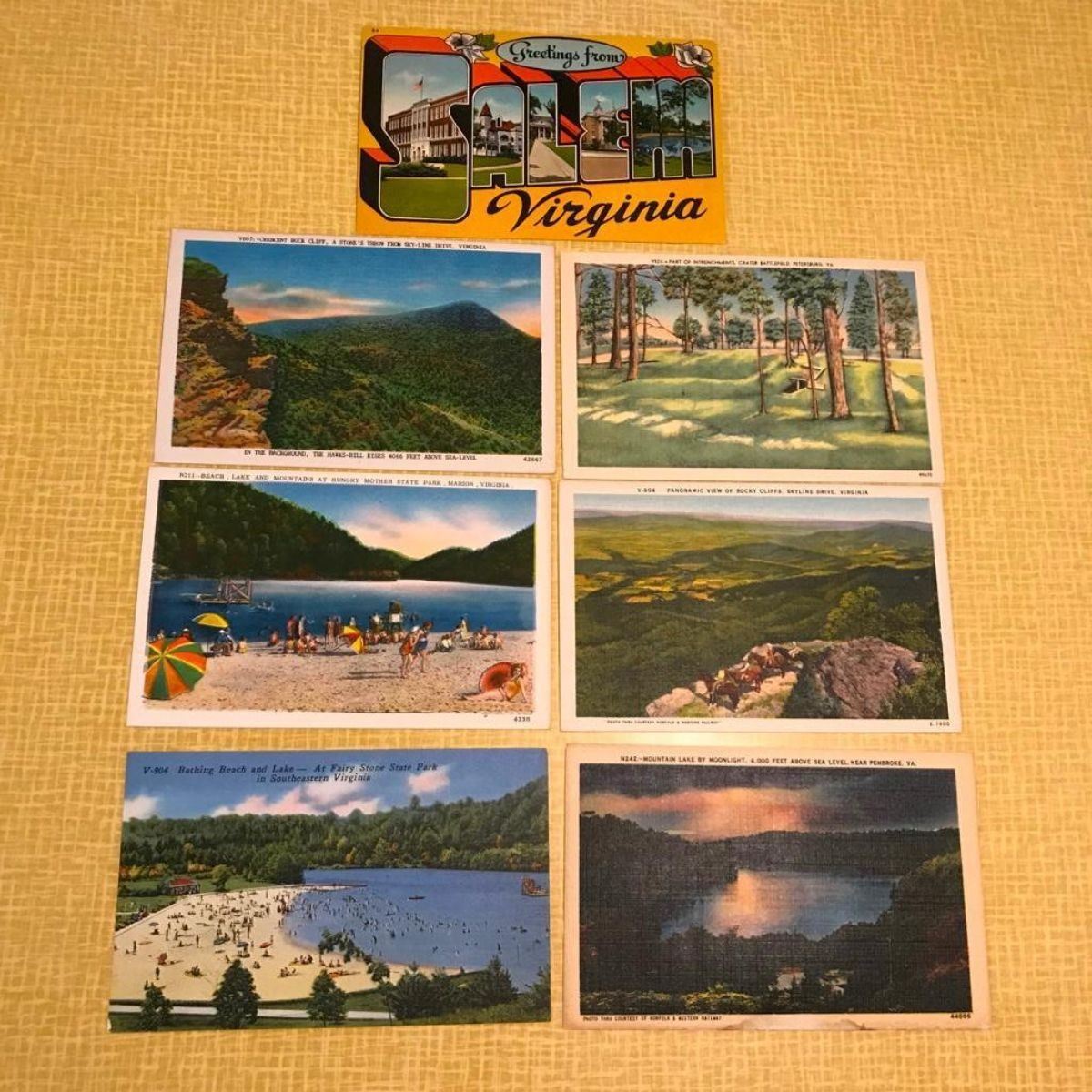 Group of 7 vintage mid-20th-century linen travel postcards from the state of Virginia. Features skyline drive, crescent rock cliff, Pembroke, Petersburg Civil War battlefield, Fairy Stone state park & Hungry Mother state park in Marion. 3 1/2" X 5 1/2" size. Good unused condition.Â