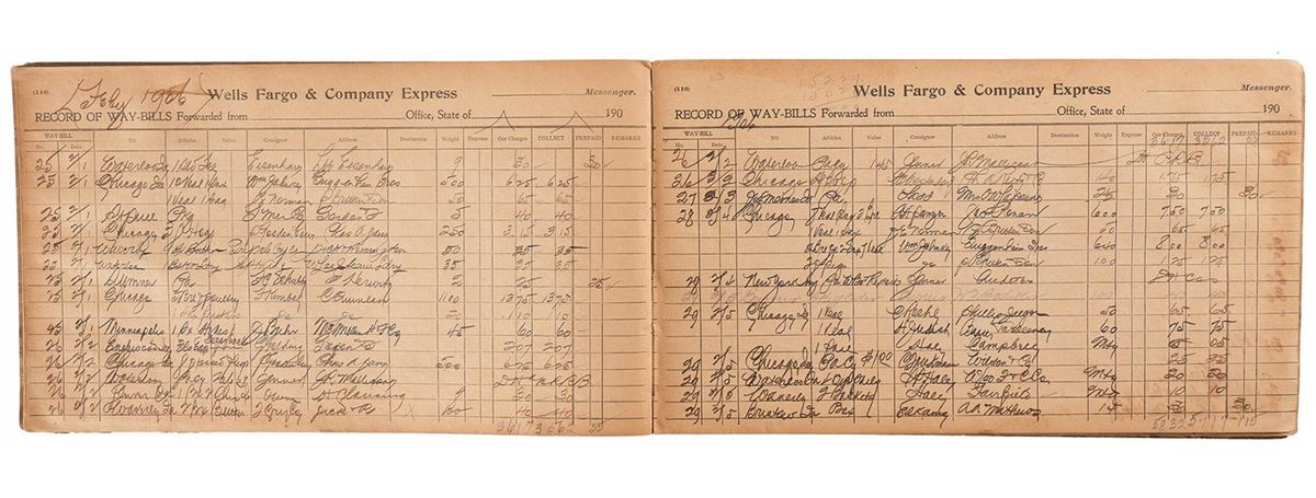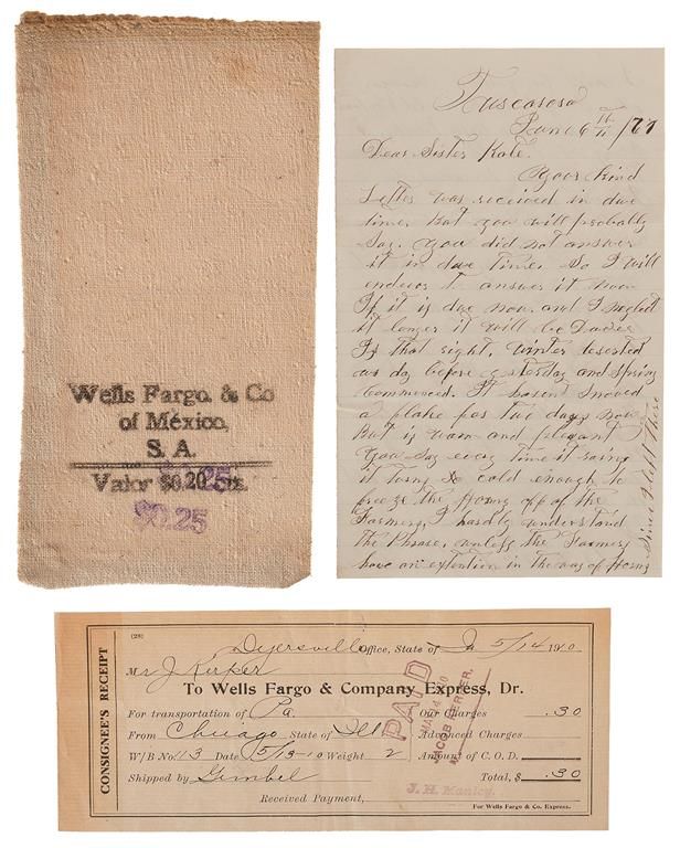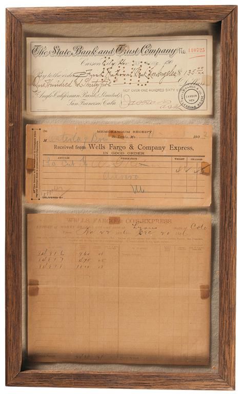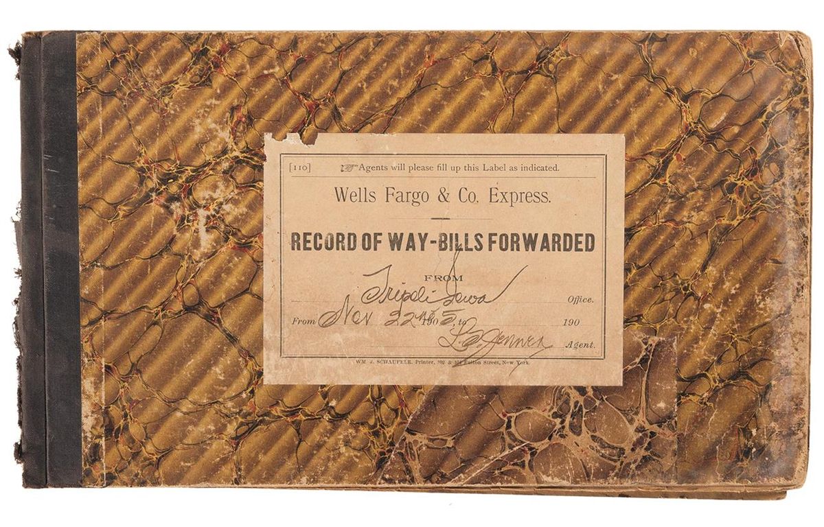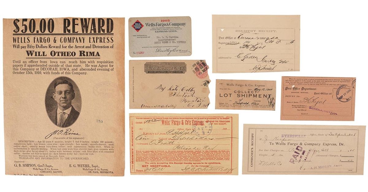 1) Ledger, "RECORD OF WAY-BILLS FORWARDED", labeled to the Tripoli, Iowa office of Wells Fargo & Company, starting November 22, 1905, signed by WF&C agent L. Jenner. 2) Framed display of Wells Fargo Papers, including a money order to the First National Bank of Los Angeles dated September 8 1903, a 1902 dated St. Louis Memorandum Receipt, and a Report of Money Orders from Lyons, Colorado dated 1886. 3) Binder of Wells Fargo papers, including a 1910 dated poster announcing a $50 (approximately $1,200, inflation adjusted) reward for the capture of a Wells Fargo agent who robbed his own post, a card granting free shipping to a WF&C superintendent, a letter and envelope sent via WF, consignors receipts and a small moneybag marked for "Wells Fargo & Co/of Mexico/S.A." originally marked 20 cents and overstamped 25.