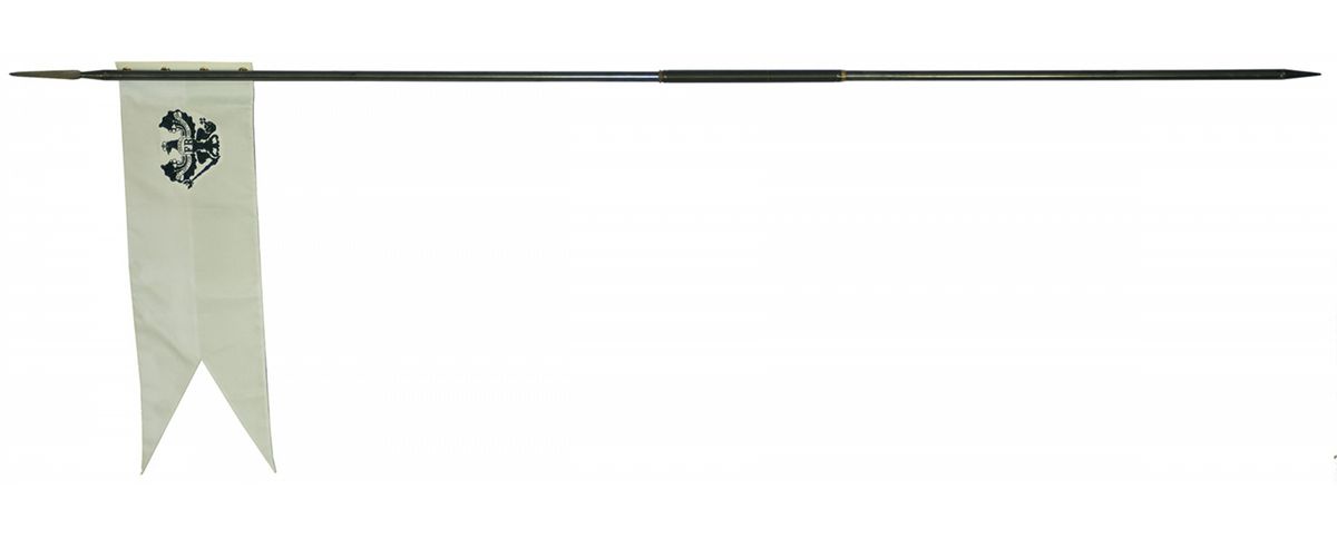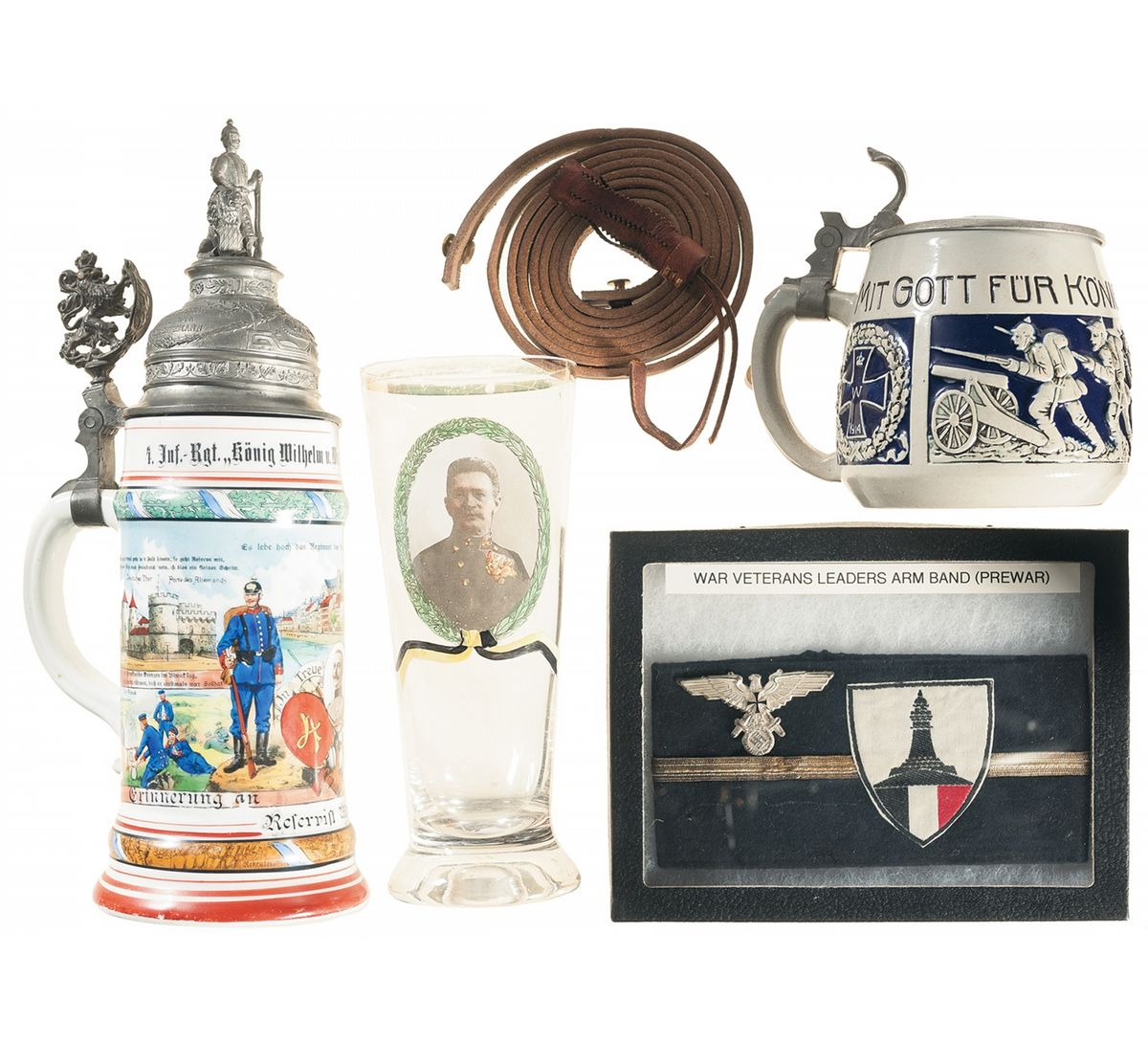 1) Weyersberg Kirschbaum & Co Argentine Model 1895 lance, 126" long, 7" leaf shaped blade, with a 41" double tail Prussian banner and a leather portepee. Thin crack in wooden handrest. 2) Pilsner glass, 8 1/4" tall, featuring Franz Conrad von Hoefzendorf, Chief of the General Staff at the outbreak of WWI. 3) Lidded service commemorative stein for the 4th Infantry Regiment, 11th Company. Light chipping. 4) Armband for the veteran's association "Kyffhauserbund", with gold bullion rank stripe and a Nazi-era German eagle badge added. 5) Half-liter lidded stein with blue enamel accented infantry scenes and "Joh. Georg Benker." on the lid. Items good overall.