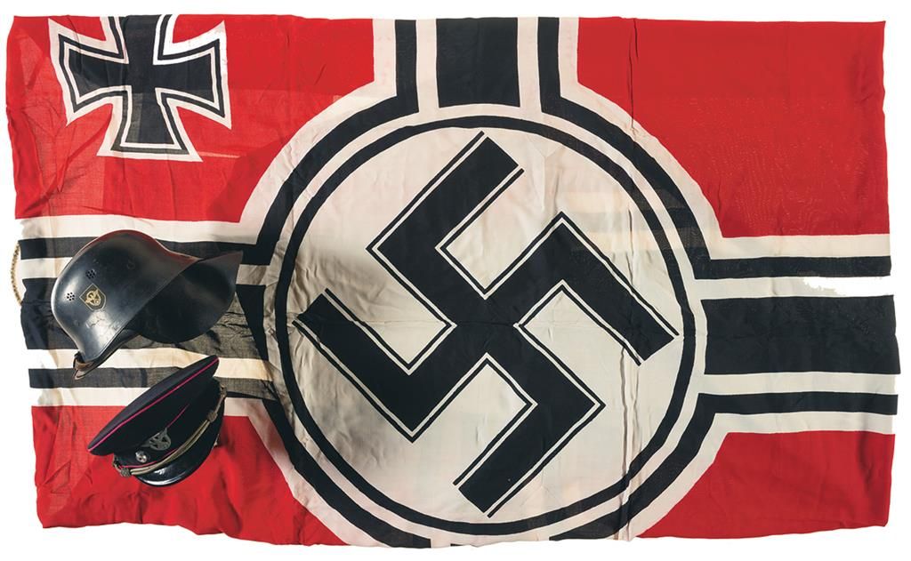 Helmet with chin strap, liner, eagle decal left side and swastika decal right side (very good plus). 54" x 95" battle flag (excellent), Police visor with pink piping and detached cockade (excellent)