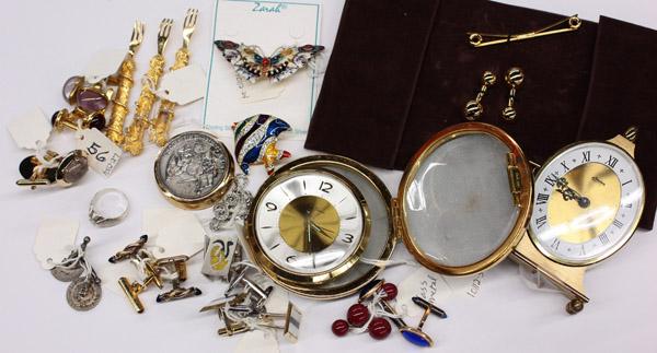 Collection of miscellaneous jewelry items, including; twelve pairs of gentlemen's cufflinks, an 18k white gold ring with a clear stone, two fashion brooches, one of a fish the other of a butterfly, gold plated decorative forks, pill box, two desk clocks and gentlemen's tie clip, pin and cufflinks set