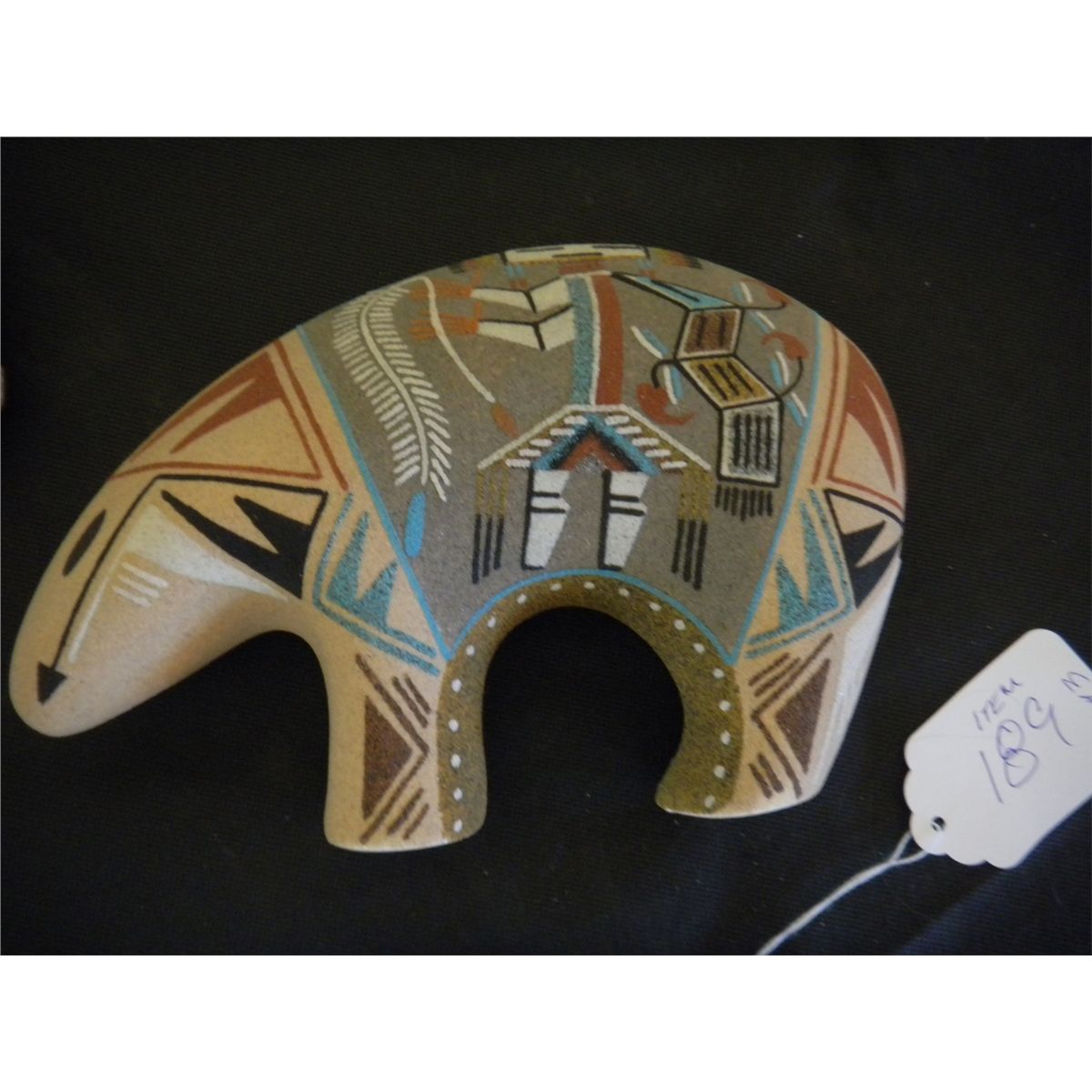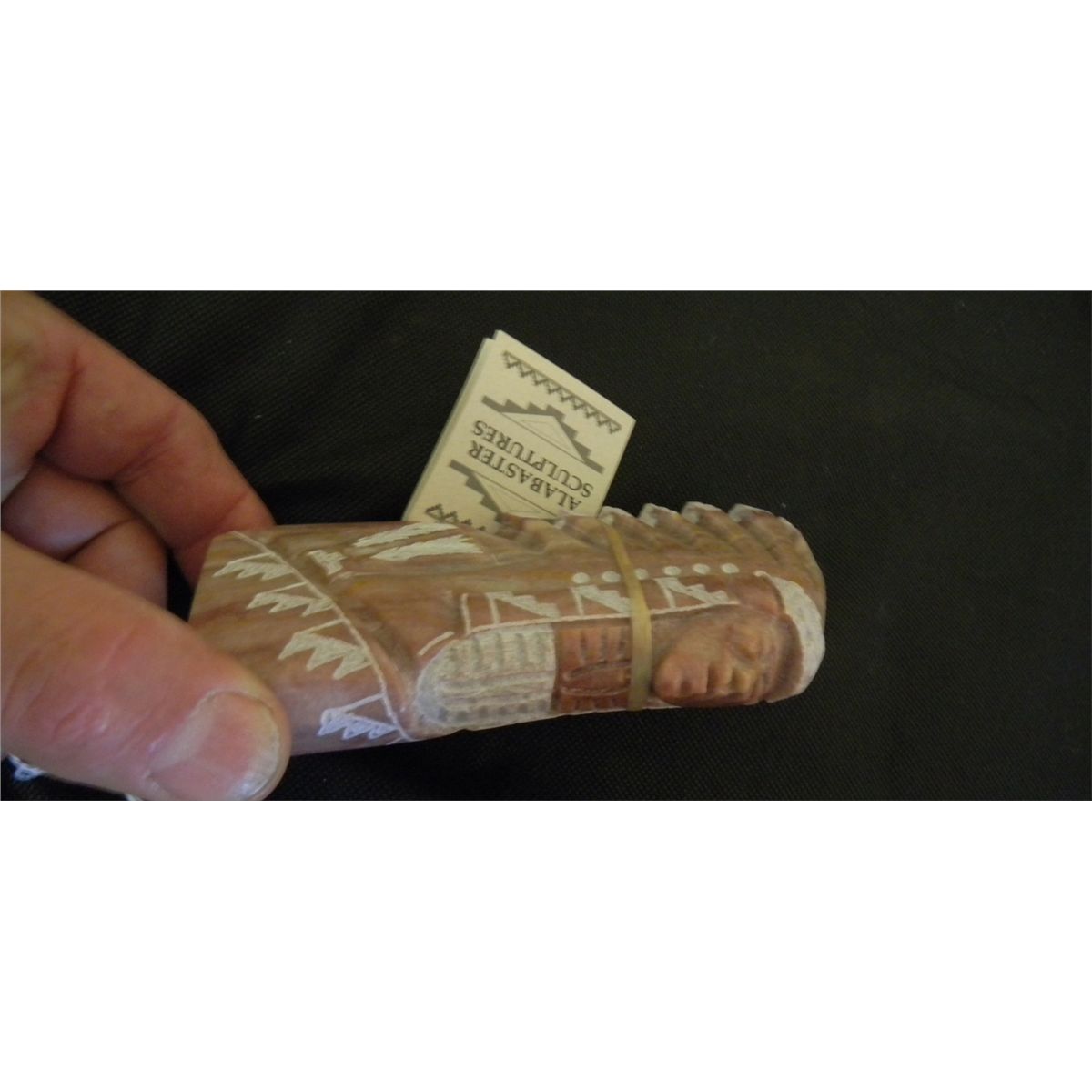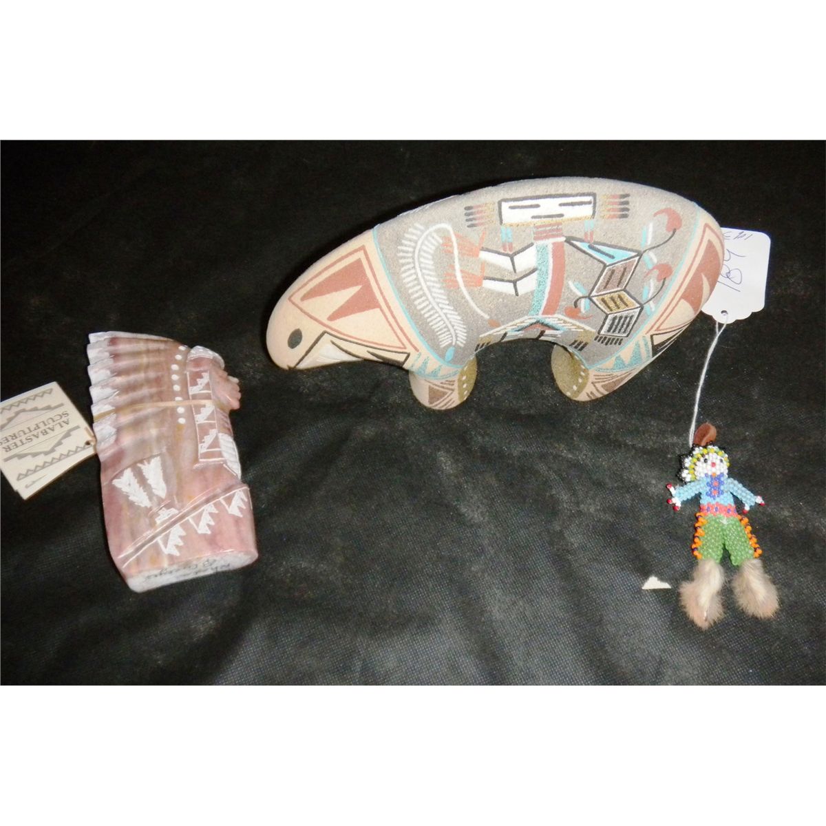 Three items group one Alabaster Sculpture of Indian Sculputure,6"x3"x1" Beaded Zuni Foot Fetish 3"x2"; Bear Fetish with Sand paintings -8"x3", Shipping $12.00