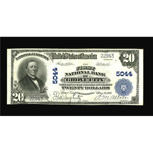 <B>Grove City, PA</B></I> - $20 1902 Plain Back Fr. 658 <B>The First NB</B></I> Ch. # 5044<BR>A lone center fold is noted on this bright <B>About Uncirculated</B></I> issue. The overprint is bold as are the signatures of F.W. Daugherty and A.M. Allen.<BR><BR><b>Shipping:</b> Coins & Currency (<a target="_blank" href="http://www.heritageauctions.com/common/shipping.php">view shipping information</a>)