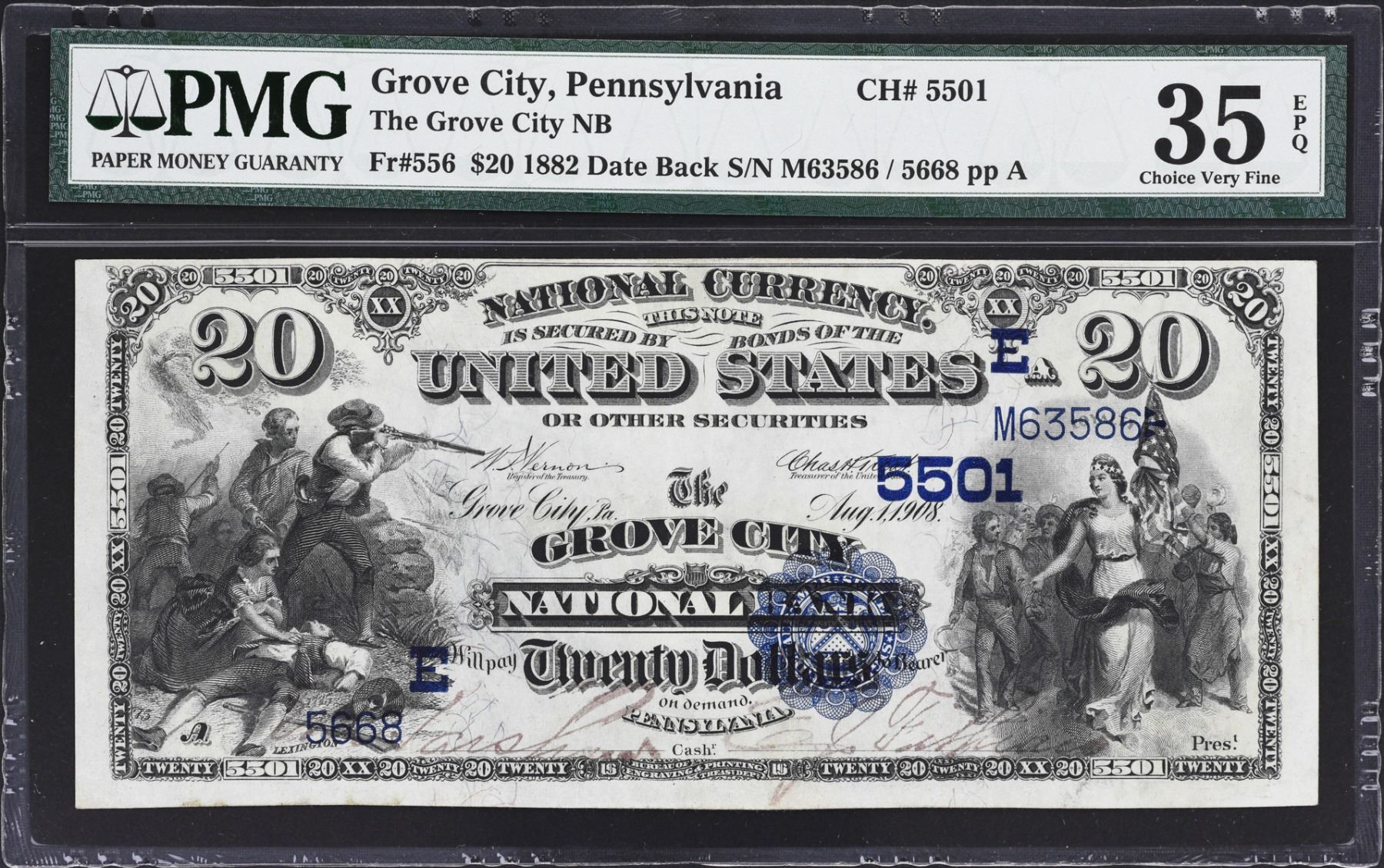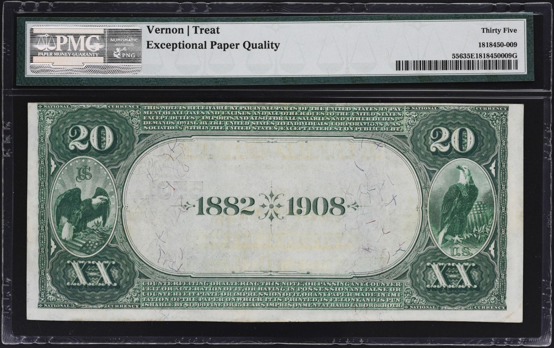 A rare bank in relation to second charter period notes with this being one of just a trio known. A single Five Dollar brown back is seen which is unique for the first title. This $20 date back is the sole piece available for the type and the first to bear the second title among those known. A $20 value back completes the three and the quality of all are below this offering. Locating any original mid-grade note for this design is challenging and we are sure this offering will not disappoint.